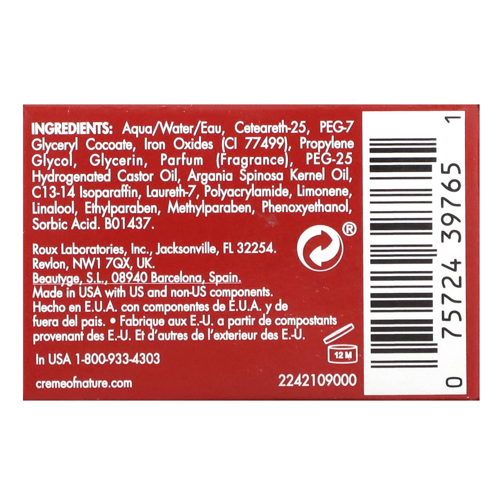 Вода, цетеарет-25, ПЭГ-7 глицерил кокоат, оксиды железа (CI 77499), пропиленгликоль, глицерин, парфюмерная композиция (отдушка), ПЭГ-25 гидрогенизированное касторовое масло, масло из косточек аргании (Argania spinosa), изопарафин c13-14, лаурет-7, полиакриламид, лимонен, линалоол, этилпарабена, метилпарабен, феноксиэтанол, сорбиновая кислота.
