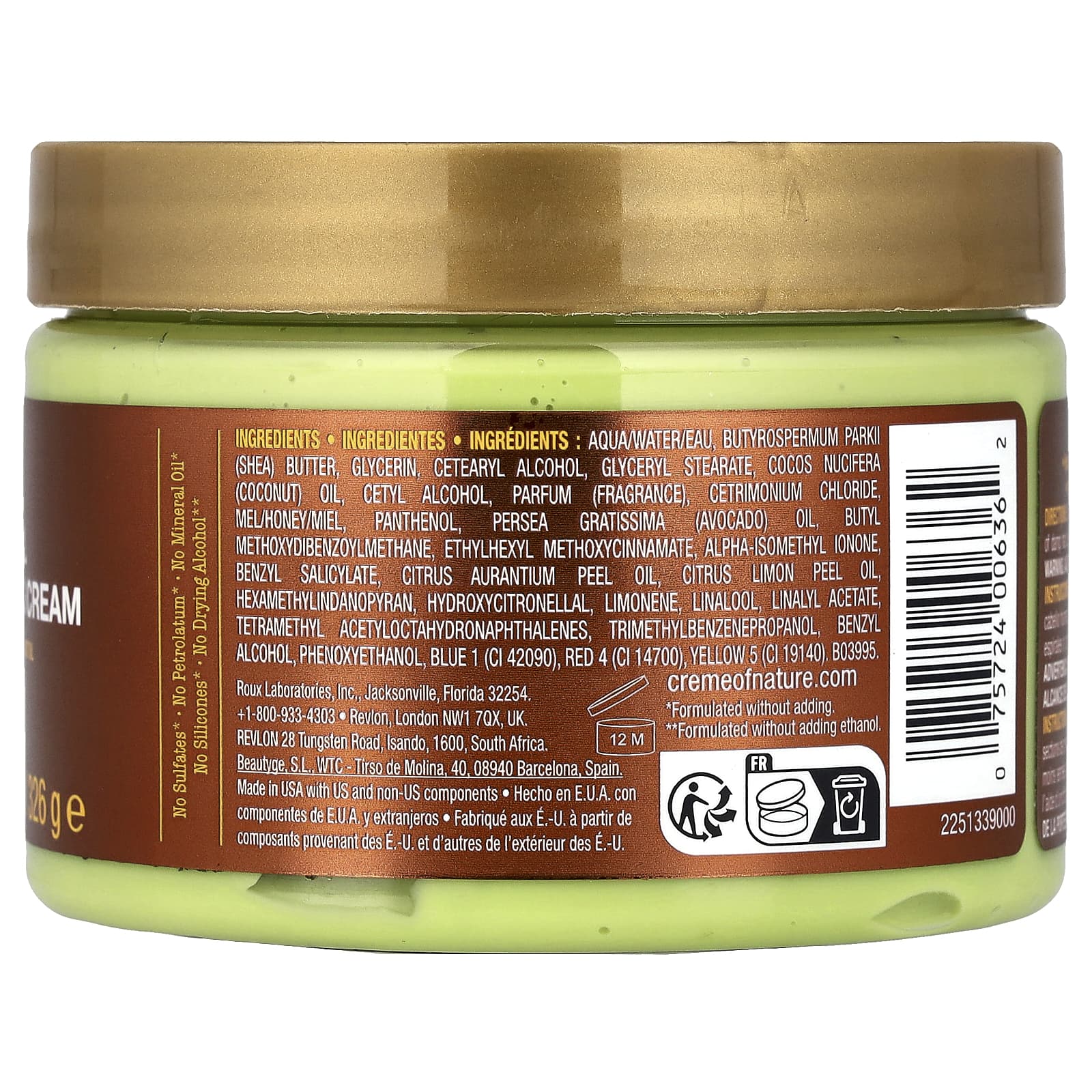 Вода (Aqua/eau), Масло Butyrospermum parkii (Ши), глицерин, Цетеариловый спирт, глицерил стеарат, кокосовое масло (Cocos nucifera), цетиловый спирт, парфюмерная композиция (отдушка), хлорид цетримония, мел/мед/миель, пантенол, масло авокадо (Persea gratissima), бутилметоксидибензоилметан, этилгексил метоксициннамат, альфа-изометилионон, бензилсалицилат, масло из цедры померанца (Citrus aurantium), масло из цедры лимона (Citrus limon), гексаметилиндавнопиран, гидроксицитронеллал, лимонен, линалоол, линалилацетат, тетраметилацетилоктагидронафталины, триметилбензолпропанол, бензиловый спирт, феноксиэтанол, краситель синий 1 (CI 42090), краситель красный 4 (CI 14700), краситель жёлтый 5 (CI 19140).