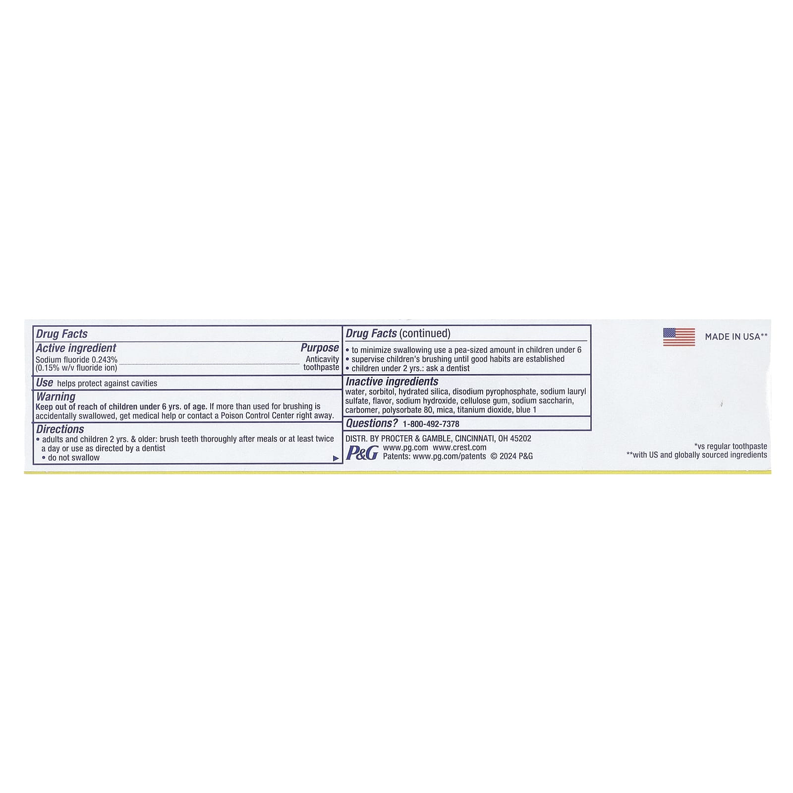 | Вода, сорбитол, гидратированный диоксид кремния, динатрий пирофосфат, лаурилсульфат натрия, ароматизатор, гидроксид натрия, целлюлозная камедь, сахарин натрия, карбомер, полисорбат 80, слюда, диоксид титана, синий 1. с ингредиентами из США и других стран. | |