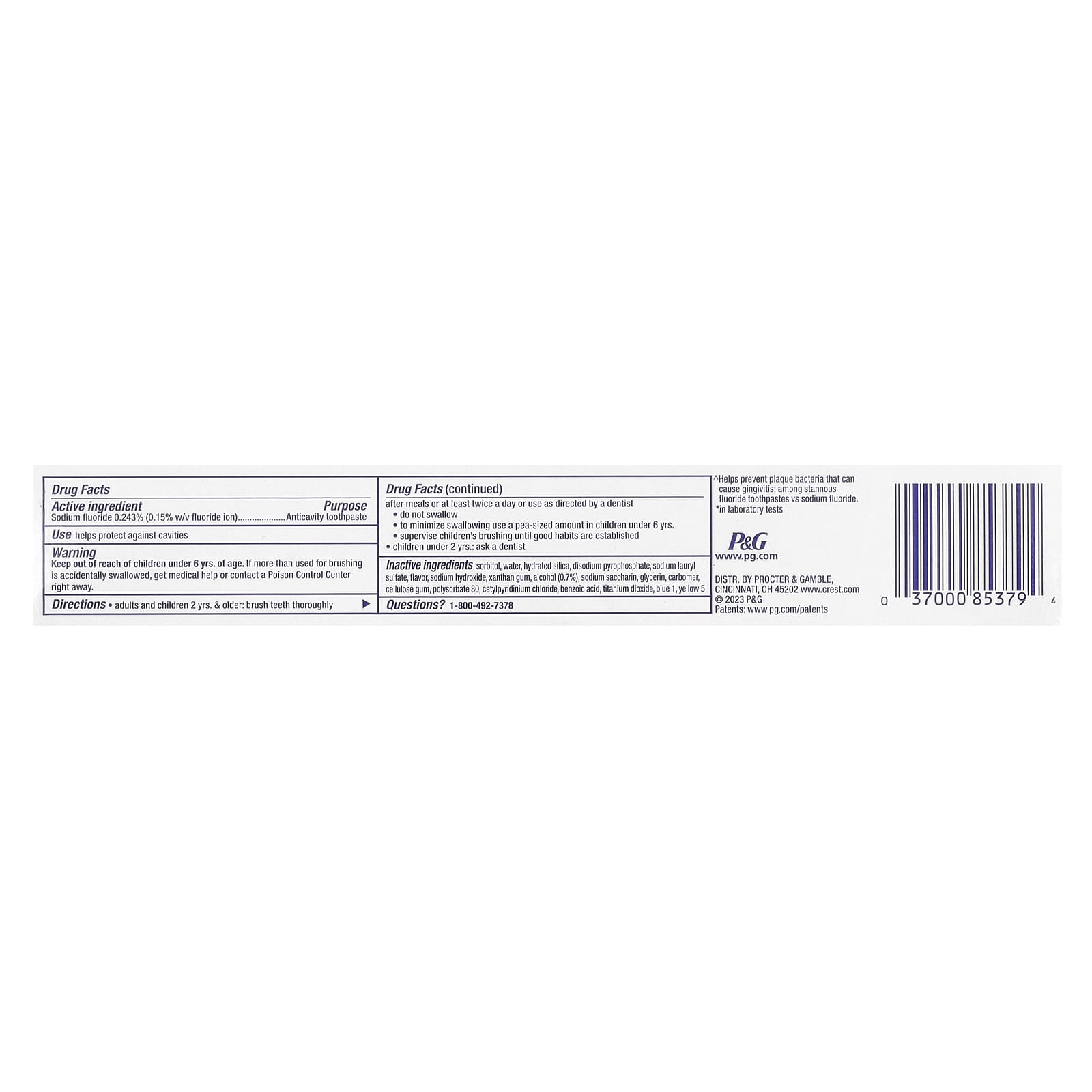 Неактивные ингредиенты: Сорбитол, вода, гидратированный диоксид кремния, динатрий пирофосфат, лаурилсульфат натрия, ароматизатор, гидроксид натрия, ксантановая камедь, спирт (0,7%), сахарин натрия, глицерин, карбомер, целлюлозная камедь, полисорбат 80, цетилпиридиния хлорид, бензойная кислота, диоксид титана, синий 1, желтый 5.