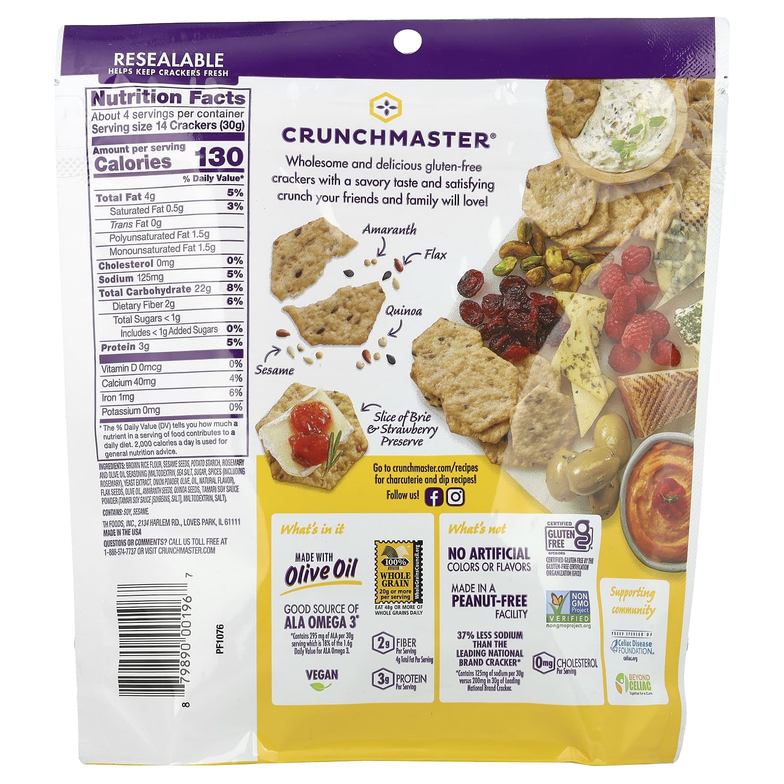 Мука из коричневого риса, семена кунжута, картофельный крахмал, розмарин и приправы из оливкового масла (мальтодекстрин, морская соль, сахар, специи (включая розмарин), экстракт дрожжей, луковый порошок, оливковый, масло, натуральный ароматизатор), семена льна, оливковое масло, семена амаранта, семена киноа, порошок из соевого соуса тамари (соевый соус тамари [соевые бобы, соль], мальтодекстрин, соль.