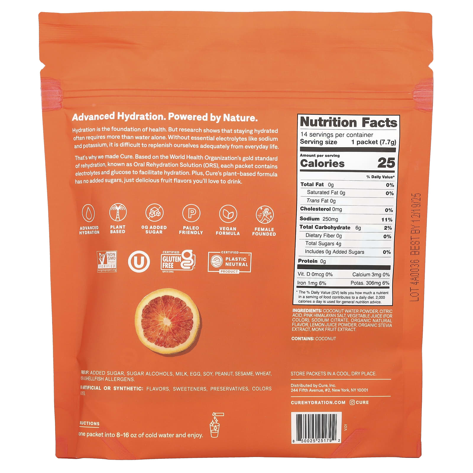 Вот почему мы сделали Cure. В соответствии с золотым стандартом регидратации Всемирной организации здравоохранения, известным как раствор для пероральной регидратации (ORS), каждый пакетик содержит электролиты и глюкозу для облегчения гидратации. Кроме того, в состав Cure на растительной основе не добавлен сахар, а только восхитительный фруктовый вкус, который вам понравится.