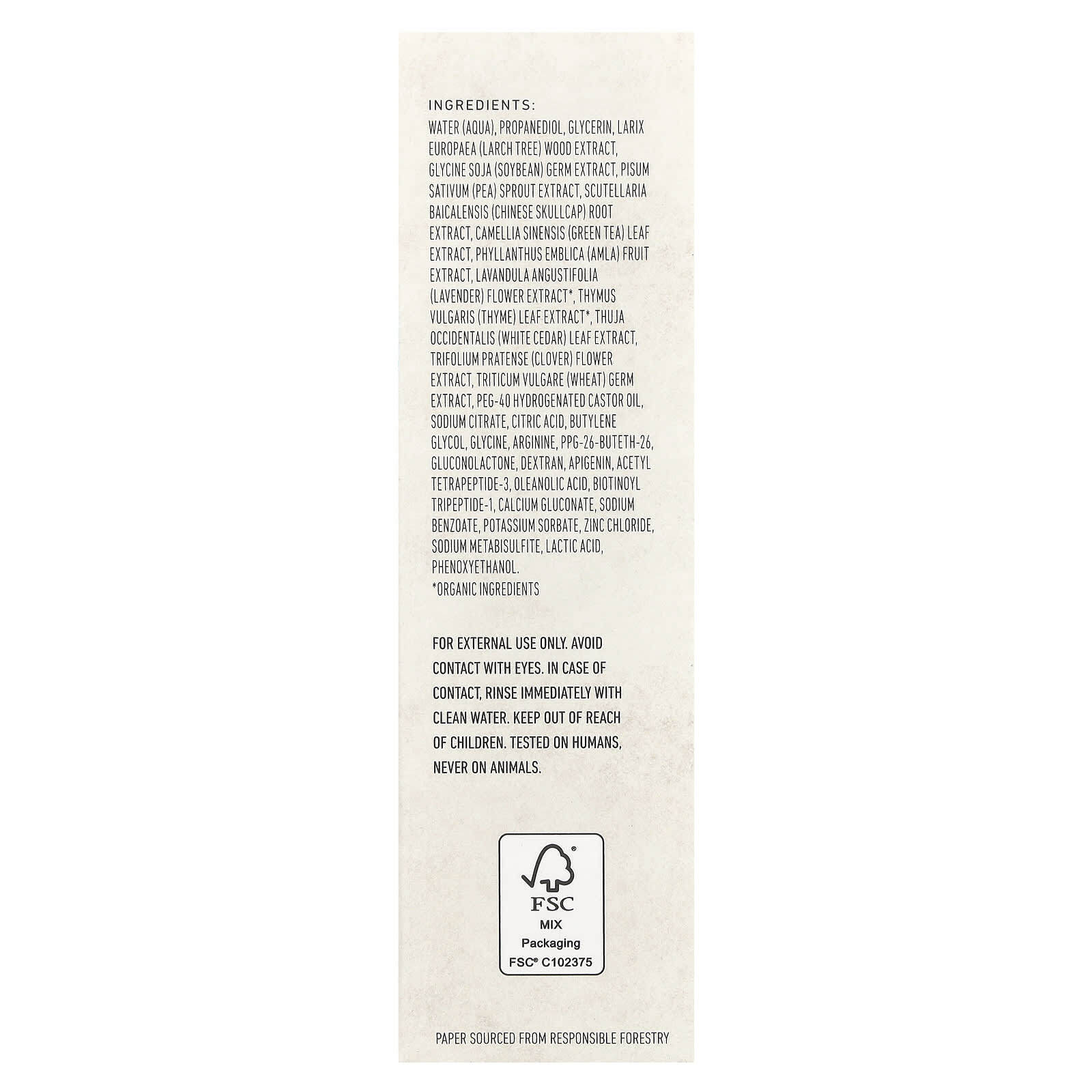 Вода, пропандиол, глицерин, экстракт древесины larix europaea (лиственница), экстракт ростков сои (Glycine soja), экстракт ростков гороха (Pisum sativum), экстракт корня шлемника (Scutellaria baicalensis), экстракт листьев зеленого чая (Camellia sinensis), экстракт плодов phyllanthus emblica (amla), экстракт листьев гамамелиса (Hamamelis virginiana), экстракт цветов лаванды узколистной (лаванды) *, экстракт листьев тимьяна обыкновенного (тимьяна) *, cedrus atlantica (кедр) экстракт коры, ПЭГ-40 гидрогенизированное касторовое масло, экстракт цветков клевера (Trifolium pratense), экстракт ростков пшеницы (Triticum vulgare), цитрат натрия, лимонная кислота, бутиленгликоль, глицин, аргинин, ППГ-26-бутет-26, глюконолактон, декстран, апигенин, ацетил тетрапептид-3, олеаноловая кислота, биотиноил трипептид-1, глюконат кальция, бензоат натрия, сорбат калия, хлорид цинка, метабисульфит натрия, молочная кислота, феноксиэтанол.