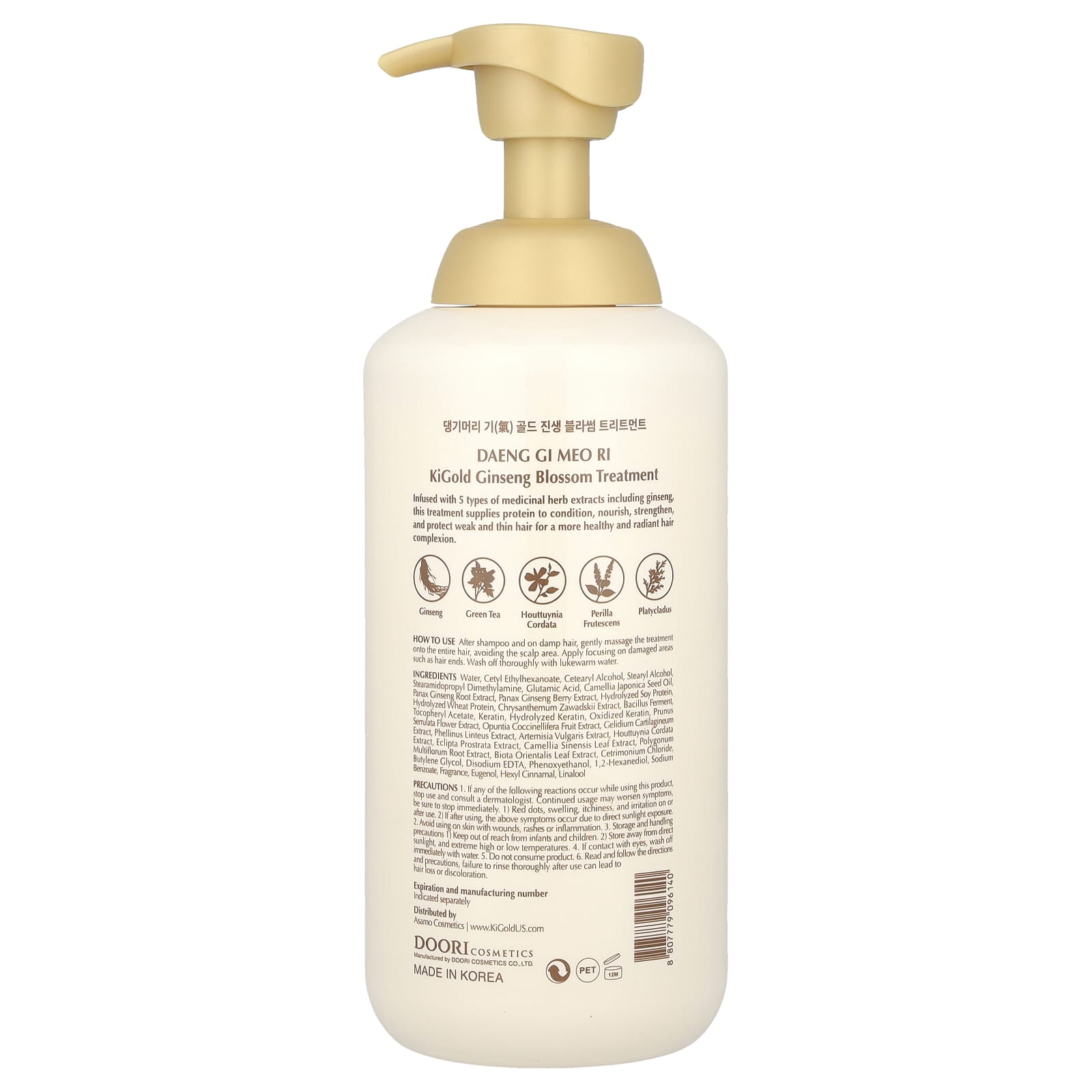 Вода, цетилэтилгексаноат, цетеариловый спирт, стеариловый спирт, стеарамидопропилдиметиламин, глутаминовая кислота, масло из семян камелии японской (Camellia japonica), экстракт корня женьшеня (Panax ginseng), экстракт ягод женьшеня, гидролизованный белок из сои, гидролизованный протеин из пшеницы, экстракт хризантемы Завадского (Chrysanthemum zawadskii), бацилла, токоферилацетат, кератин, гидролизованный кератин, окисленный кератин, экстракт цветков чернослива (Prunus serrulata), экстракт плодов опунции кошениленосной (Opuntia coccinellifera), экстракт агарофита (Gelidium cartilagineum), экстракт санхвана (Phellinus linteus), экстракт полыни (Artemisia vulgaris), экстракт хауттюйнии (Houttuynia cordata), экстракт эклипты простроты, экстракт листьев зеленого чая (Camellia sinensis), экстракт корня горца многоцветкового (Polygonum multiflorum), экстракт листьев биоты восточной, цетримония хлорид, бутиленгликоль, двунатриевая ЭДТК, феноксиэтанол, 1,2-гександиол, бензоат натрия, отдушка, эвгенол, гексил циннамал, линалоола.