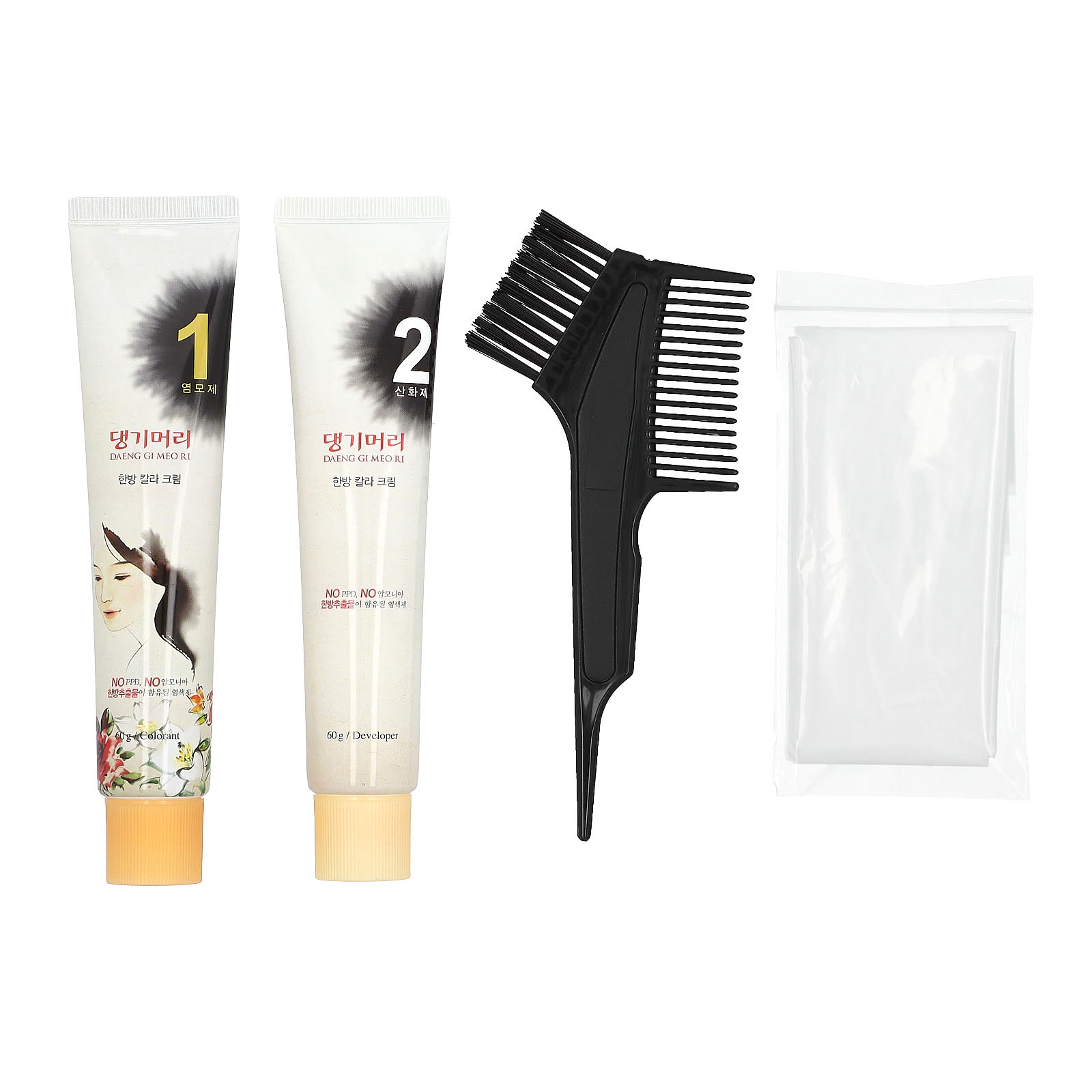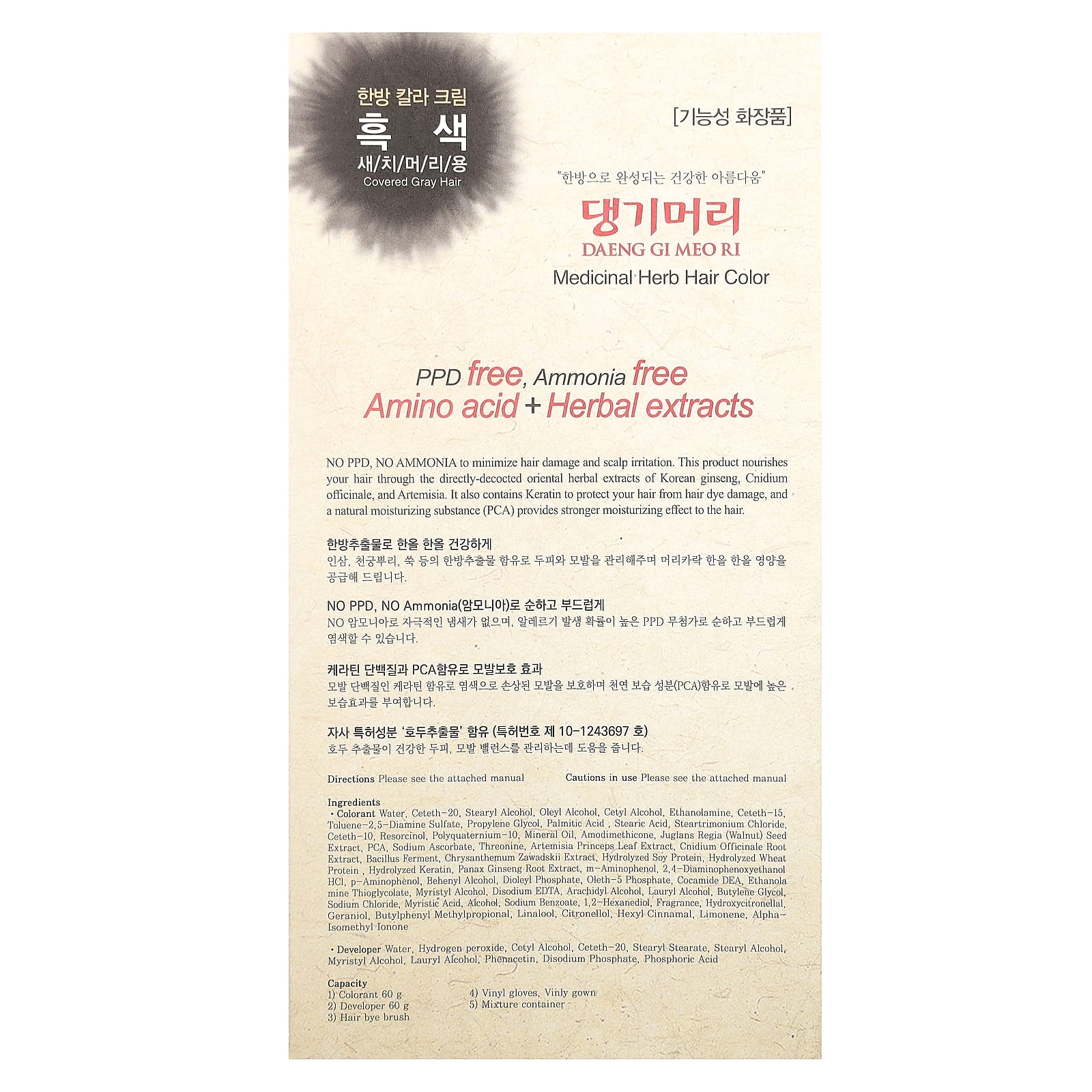 Краситель: Вода, цетет-20, стеариловый спирт, олеиловый спирт, цетиловый спирт, этаноламин, цетет-15, толуен-2,5-диамин сульфат, пропиленгликоля, пальмитиновая кислота , стеариновая кислота, стеартримония хлорид, цетет-10, резорцин, поликватерниум-10, минерального масла, амодиметикон, экстракт семян грецкого ореха (Juglans regia), PCA, аскорбат натрия, треонин, экстракт листьев полыни корейской (Artemisia princeps), экстракт корня жгун-корня (Cnidium officinale), фермент палочковидной бактерии, экстракт хризантемы Завадского (Chrysanthemum zawadskii), гидролизованный белок из сои, гидролизованный протеин из пшеницы , гидролизованный кератин, экстракт корня женьшеня (Panax ginseng), м-аминофенол, 2,4-диаминофеноксиэтанола гидрохлорид, п-аминофенол, бегениловый спирт, диолеилфосфат, олет-5 фосфат, кокамид ДЭА, этаноламин тиогликолат, миристиловый спирт, двунатриевая ЭДТК, арахидиловый спирт, лауриловый спирт, бутиленгликоль, хлорид натрия, миристиновая кислота, спирт, бензоат натрия, 1,2-гександиол, отдушка, гидроксицитронеллаль, гераниол, бутилфенил метилпропиональ, линалоол, цитронеллол, гексил циннамал, лимонен, альфа-изометилионон.