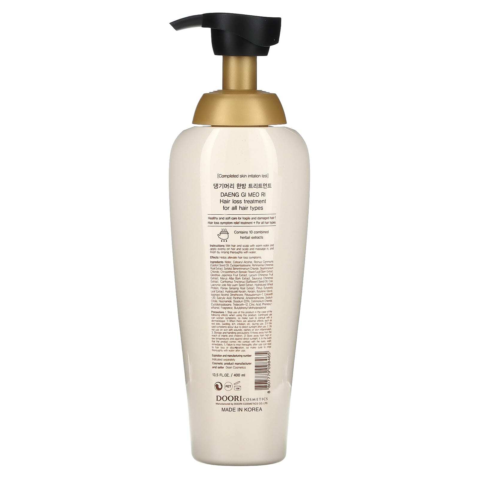 Вода, цетеариловый спирт, касторовое масло (Ricinus communis), циклопентасилоксан, экстракт корня ремании клейкой (Rehmannia chinensis), сорбитол, бегентримония хлорид, стеартримония хлорид, экстракт цветков хризантемы бореале (Chrysanthemum boreale), экстракт плодов гледичии японской (Gleditsia japonica), экстракт ягод годжи (Lycium chinense), экстракт коры шелковицы белой (Morus alba), экстракт савруруса китайского (Schisandra chinensis), масло семян сафлора (Carthamus tinctorius), экстракт семян ма-юен (Cox lacryma-jobi), гидролизованный протеин из пшеницы, экстракт корня женьшеня (Panax ginseng), экстракт хвои сосны (Pinus sylvestris), гидролизованный кератин, кератин, бутиленгликоль, изопропиловый спирт, диметикон, поликватерниум-7, цетеарет-20, салициловой кислоты, пантенол, амодиметикон, цитрат натрия, никотинамид, двунатриевая ЭДТК, цетримония хлорид, циклотетрасилоксан, тридецет-12, лимонная кислота, феноксиэтанол, отдушка, бутилфенил метилпропиональ.