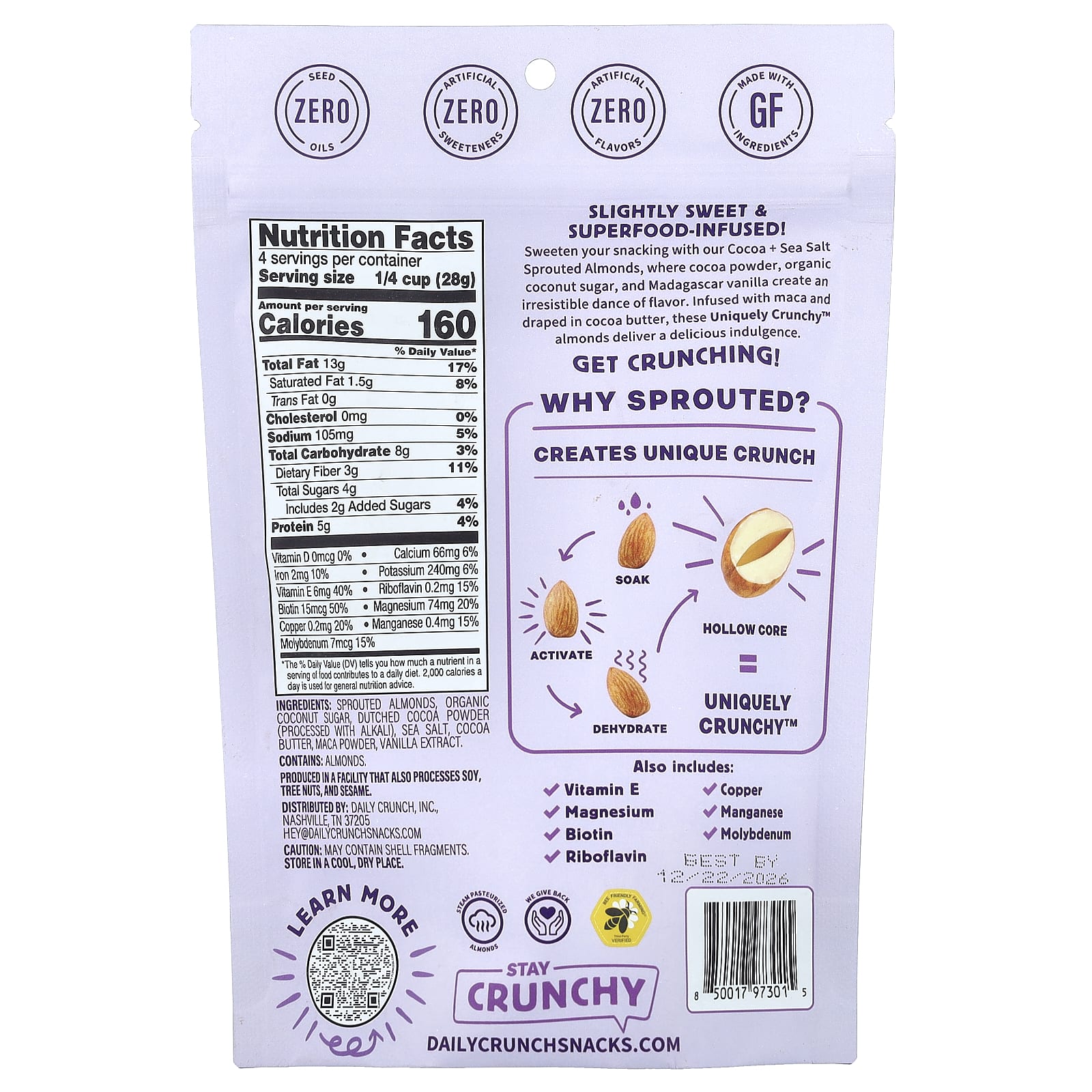 Подсластите свой перекус нашим пророщенным миндалем с какао и морской солью, в котором какао-порошок, органический кокосовый сахар и мадагаскарская ваниль создают невероятно вкусный напиток.Этот миндаль Uniquely Crunchy™, обогащенный макой и какао-маслом, подарит вам восхитительное наслаждение.Наслаждайтесь хрустом!