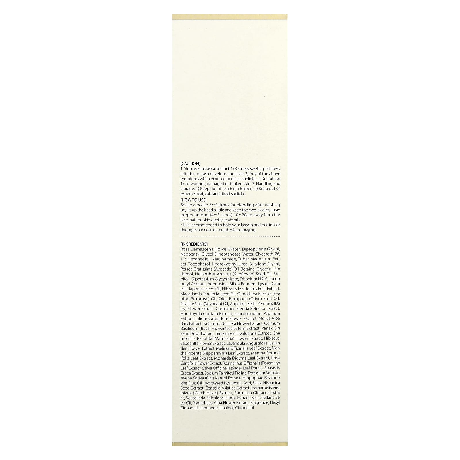 Вода из цветков розы дамасской (Rosa damascena), дипропиленгликоль, неопентилгликоль дигептаноат, вода, глицерет-26,1,2-гександиол, ниацинамид, экстракт белого трюфеля (Tuber magnatum), токоферол, гидроксиэтилированная мочевина, бутиленгликоль, масло авокадо (Persea gratissima), бетаин, глицерин, пантенол, подсолнечное масло (Helianthus annuus), сорбитол, дикалия глицирризат, двунатриевая ЭДТК, токоферилацетат, аденозин, лизат ферментов бифидобактерий, масло из семян камелии японской (Camellia japonica), экстракт плодов гибискуса (Hibiscus esculentus), масло макадамии (Macadamia ternifolia), масло примулы вечерней (Oenothera biennis), оливковое масло (Olea europaea), соевое масло (Glycine soja), аргинин, экстракт цветков маргаритки многолетней (Bellis perennis), карбомер, экстракт фрезии (Feesia refracta), экстракт хауттюйнии сердцевидной (Houttuynia cordata), экстракт эдельвейса альпийского (Leontopodium alpinum), экстракт цветков белой лилии (Lilium candidum), экстракт коры шелковицы белой (Morus alba), экстракт цветков лотоса (Nelumbo nucifera), экстракт цветков, листьев и стеблей базилика (Ocimum basilicum), экстракт корня женьшеня (Panax ginseng), экстракт соссюреи (Saussurea involucrata), экстракт цветков ромашки лекарственной (Chamomilla recutita), экстракт цветков розеллы (Hibiscus sabdariffa), экстракт цветков лаванды (Lavandula angustifolia), экстракт листьев мелиссы (Melissa officinalis), экстракт листьев перечной мяты (Mentha piperita), экстракт листьев мяты яблочной (Mentha rotundifolia), экстракт листьев монарды двойчатой (Monarda didyma), экстракт цветков розы столистной (Rosa centifolia), экстракт листьев розмарина (Rosmarinus officinalis), экстракт листьев шалфея (Salvia officinalis), экстракт спарассиса курчавого (Sparassis crispa), пальмитоил пролин натрия, сорбат калия, экстракт ядер овса (Avena sativa), масло из плодов облепихи крушиновидной (Hippophae rhamnoides), гидролизованная гиалуроновая кислота, экстракт семян чиа (Salvia hispanica), экстракт готу колы (Centella asiatica), экстракт гамамелиса (Hamamelis virginiana), экстракт портулака огородного (Portulaca oleracea), экстракт корня шлемника (Scutellaria baicalensis), масло из семян аннато (Bixa orellana), экстракт цветков кувшинки белой (Nymphaea alba), отдушка, гексил циннамал, лимонен, линалоол, цитронеллол.
