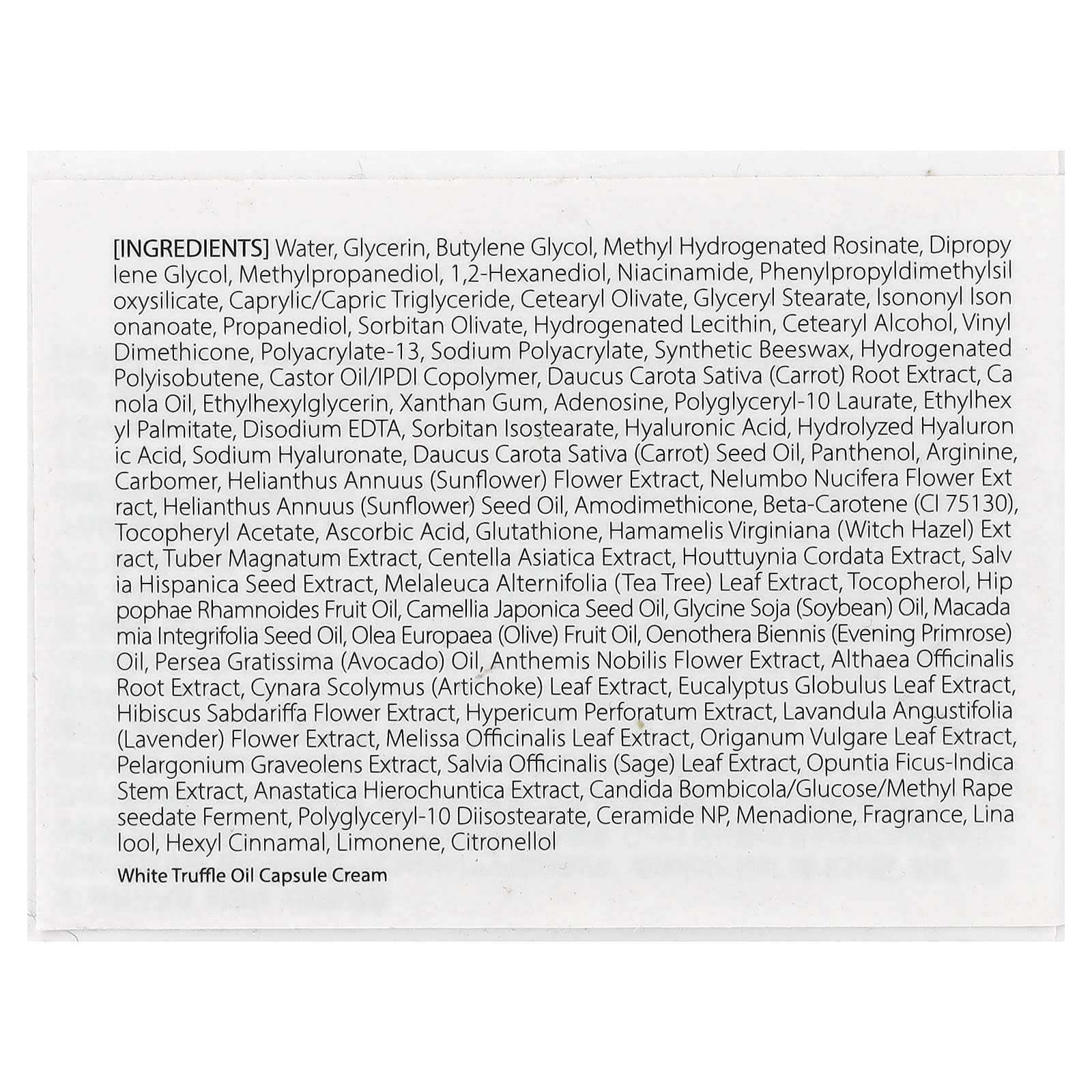 Вода, глицерин, бутиленгликоль, метил-гидрогенизированный розинат, дипропиленгликоль, метилпропандиол, 1,2-гександиол, никотинамид, фенилпропилдиметилсилоксисиликат, каприловый/каприновый триглицерид, цетеарил оливат, глицерил стеарат, изононил изононаноат, пропандиол, сорбитан оливат, гидрогенизированный лецитин, цетеариловый спирт, винил диметикон, полиакрилат-13, полиакрилат натрия, синтетический воск, гидрогенизированный полиизобутен, касторовое масло/изофорон диизоцианата сополимер, экстракт корнеплода моркови (Daucus carota sativa), рапсовое масло, этилгексилглицерин, ксантановая камедь, аденозин, полиглицерил-10 лаурат, этилгексил пальмитат, двунатриевая ЭДТК, сорбитан изостеарат, гиалуроновая кислота, гидролизованная гиалуроновая кислота, гиалуронат натрия, масло из семян моркови (Daucus carota sativa), пантенол, аргинин, карбомер, экстракт цветков подсолнечника (Helianthus annuus), экстракт цветков лотоса орехоносного (Nelumbo nucifera), подсолнечное масло (Helianthus annuus), амодиметикон, бета-каротин (CI 75130), токоферилацетат, аскорбиновая кислота, глутатион, экстракт гамамелиса (Hamamelis virginiana), экстракт белого трюфеля (Tuber magnatum), экстракт готу колы (Centella asiatica), экстракт хауттюйнии (Houttuynia cordata), экстракт семян чиа (Salvia hispanica), экстракт листьев чайного дерева (Melaleuca alternifolia), токоферол, масло из плодов облепихи крушиновидной (Hippophae rhamnoides), масло из семян камелии японской (Camellia japonica), соевое масло (Glycine soja), масло макадамии (Macadamia integrifolia), оливковое масло (Olea europaea), масло примулы вечерней (Oenothera biennis), масло авокадо (Persea gratissima), экстракт цветков ромашки английской (Anthemis nobilis), экстракт корня алтея (Althaea officinalis), экстракт листьев артишока (Cynara scolymus), экстракт листьев эвкалипта шаровидного (Eucalyptus globulus), экстракт цветков розеллы (Hibiscus sabdariffa), экстракт зверобоя (Hypericum perforatum), экстракт цветков лаванды (Lavandula angustifolia), экстракт листьев мелиссы лекарственной (Melissa officinalis), экстракт листьев орегано (Origanum vulgare), экстракт пеларгонии (Pelargonium graveolens), экстракт листьев шалфея (Salvia officinalis), экстракт стеблей опунции индийской (Opuntia ficus-indica), экстракт анастатической (Anastatica hierochuntica), кандида бомбикола (Candida bombicola)/глюкоза/фермент метила рапса, полиглицерил-10 диизостеарат, керамид NP, менадион, отдушка, линалоол, гексил циннамал, лимонена, цитронеллола.