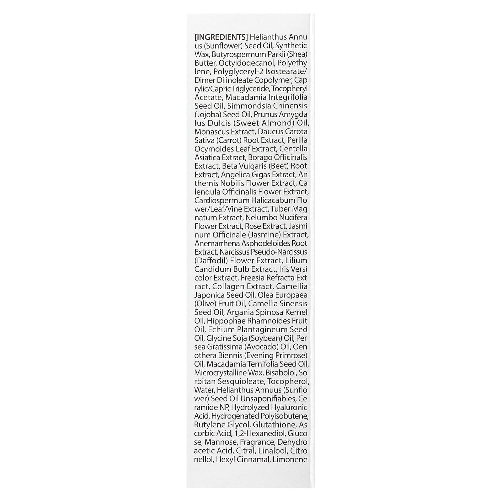 Подсолнечное масло (Helianthus annuus), синтетический воск, масло ши (Butyrospermum parkii), октилдодеканол, полиэтилен, полиглицерил-2 изостеарат/димер дилинолеат сополимер, каприловый/каприновый триглицерид, токоферилацетат, масло макадамии (Macadamia integrifolia), масло из семян жожоба (Simmondsia chinensis), масло сладкого миндаля (Prunus amygdalus dulcis), экстракт красного ферментированного риса (Monascus purpureus), экстракт корнеплода моркови (Daucus carota sativa), экстракт листьев периллы (Perilla ocymoides), экстракт готу колы (Centella asiatica), экстракт бурачника (Borago officinalis), экстракт корнеплода свёклы (Beta vulgaris), экстракт дудника гигантского (Angelica gigas), экстракт цветков ромашки английской (Anthemis nobilis), экстракт цветков календулы (Calendula officinalis), экстракт цветков/листьев/стеблей халикакаба (Cardiospermum halicacabum), экстракт белого трюфеля (Tuber magnatum), экстракт цветков лотоса орехоносного (Nelumbo nucifera), экстракт розы, экстракт жасмина (Jasminum officinale), экстракт корня анемаррены асфоделовидной (Anemarrhena asphodeloides), экстракт цветков нарцисса ложного (Narcissus pseudo-narcissus), экстракт луковицы лилии (Lilium candidum), экстракт ириса разноцветного (Iris versicolor), экстракт фрезии (Feesia refracta), экстракт коллагена, масло из семян камелии японской (Camellia japonica), оливковое масло (Olea europaea), масло из семян зелёного чая (Camellia sinensis), аргановое масло (Argania spinosa), масло из плодов облепихи крушиновидной (Hippophae rhamnoides), масло из семян синяка подорожникового (Echium plantagineum), соевое масло (Glycine soja), масло авокадо (Persea gratissima), масло примулы вечерней (Oenothera biennis), масло макадамии (Macadamia ternifolia), микрокристаллический воск, бисаболол, сорбитана сесквиолеат, токоферол, вода, неомыляемые фракции подсолнечного масла (Helianthus annuus), керамид NP, гидролизованная гиалуроновая кислота, гидрогенизированный полиизобутен, бутиленгликоль, глутатион, аскорбиновая кислота, 1,2-гександиол, глюкоза, манноза, отдушка, дегидроуксусная кислота, цитраль, линалоол, цитронеллол, гексил циннамал, лимонен.
