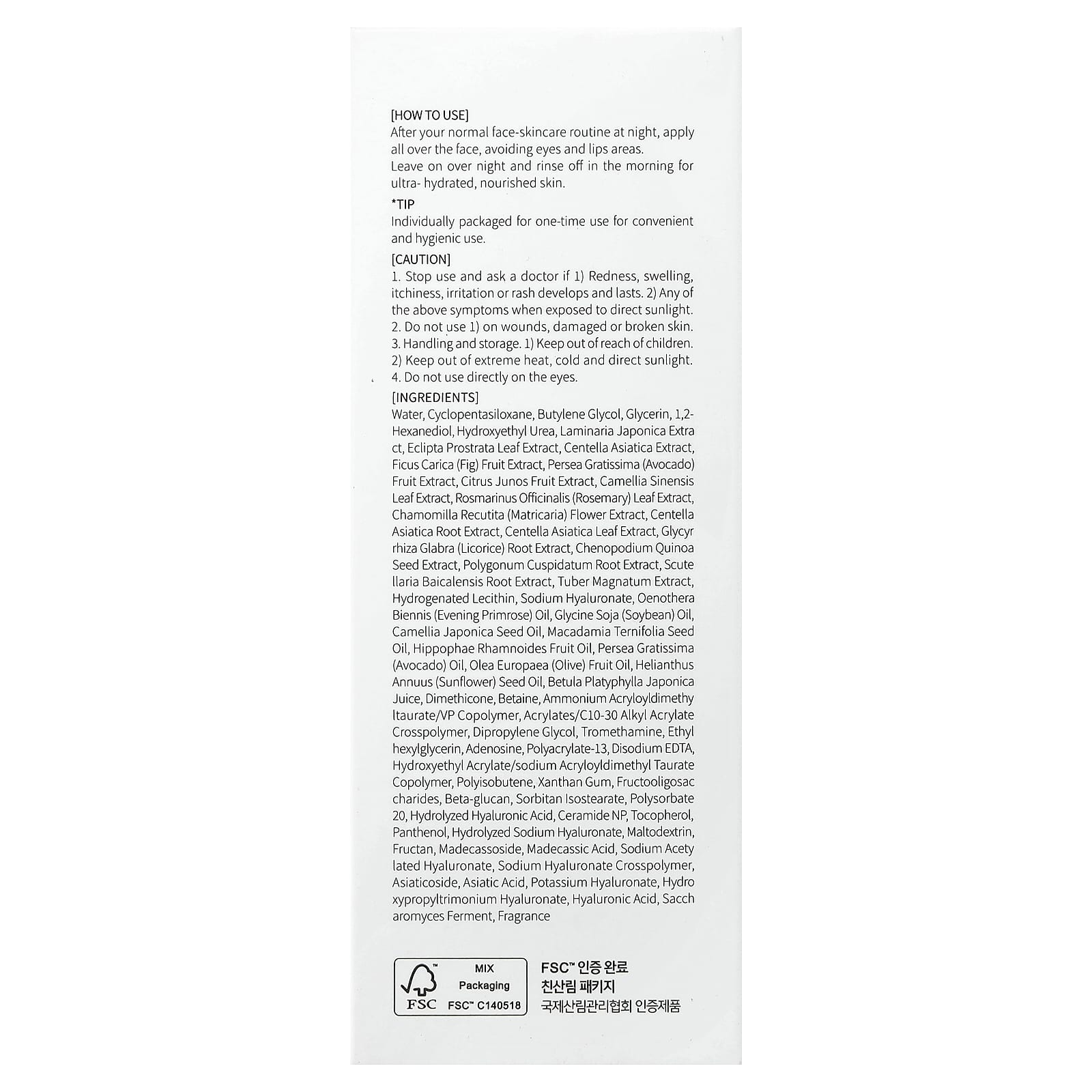 Вода, циклопентасилоксан, бутиленгликоль, глицерин, 1,2-гександиол, гидроксиэтилированная мочевина, экстракт ламинарии японской (Laminaria japonica), экстракт листьев эклипты простертой (Eclipta prostrata), экстракт готу колы (Centella asiatica), экстракт плодов инжира (Ficus carica), экстракт плодов авокадо (Persea gratissima), экстракт плодов юдзу (Citrus junos), экстракт листьев зелёного чая (Camellia sinensis), экстракт листьев розмарина (Rosmarinus officinalis), экстракт цветков ромашки лекарственной (Chamomilla recutita), экстракт корня готу колы (Centella asiatica), экстракт листьев готу колы (Centella asiatica), экстракт корня солодки (Glycyrrhiza glabra), экстракт киноа (Chenopodium quinoa), экстракт корня рейнутрии японской (Polygonum cuspidatum), экстракт корня шлемника (Scutellaria baicalensis), экстракт белого трюфеля (Tuber magnatum), гидрогенизированный лецитин, гиалуронат натрия, масло примулы вечерней (Oenothera biennis), соевое масло (Glycine soja), масло из семян камелии японской (Camellia japonica), масло макадамии (Macadamia ternifolia), масло из плодов облепихи крушиновидной (Hippophae rhamnoides), масло авокадо (Persea gratissima), оливковое масло (Olea europaea), подсолнечное масло (Helianthus annuus), сок берёзы плосколистой японской (Betula platyphylla japonica), диметикон, бетаин, аммоний акрилоилдиметилитаурат/ВП сополимер, акрилат/c10-30 алкил акрилат кроссполимер, дипропиленгликоль, трометамин, этилгексилглицерин, аденозин, полиакрилат-13, двунатриевая ЭДТК, гидроксиэтил акрилат/натрия акрилоилдиметилтаурата сополимер, полиизобутен, ксантановая камедь, фруктоолигосахариды, бета-глюкан, сорбитан изостеарат, полисорбат 20, гидролизованная гиалуроновая кислота, керамид NP, токоферол, пантенол, гидролизованный гиалуронат натрия, мальтодекстрин, фруктан, мадекассосид, мадекассовая кислота, ацетилированный гиалуронат натрия, кроссполимер гиалуроната натрия, азиатикозид, азиатиковая кислота, гиалуронат калия, гиалуронат гидроксипропилтримония, гиалуроновая кислота, продукт ферментации сахаромицетов, отдушка.