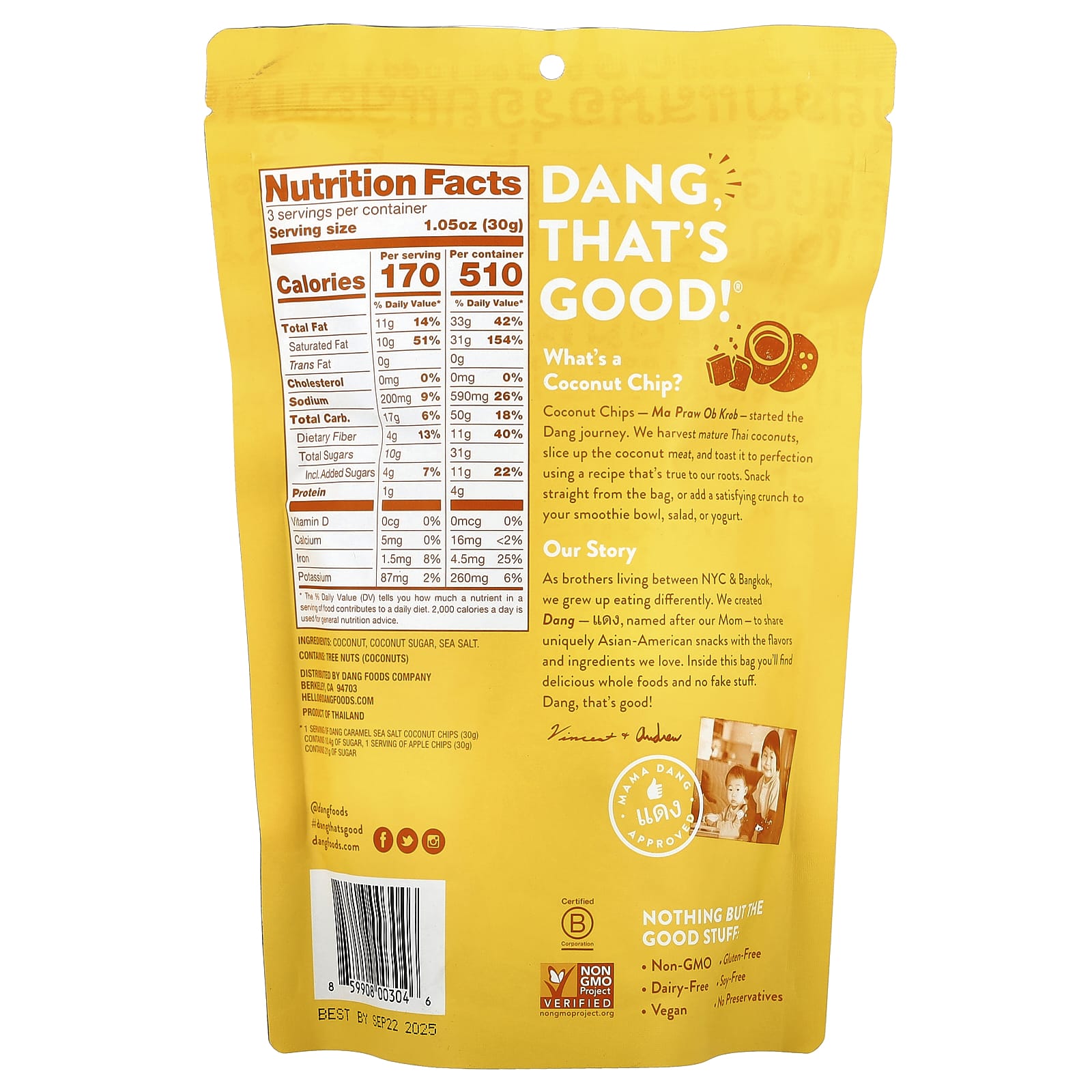 Кокосовые чипсы - Ma Praw Ob Krob - начали свое путешествие в мир Dang. Мы собираем зрелые тайские кокосы, нарезаем кокос и обжариваем его до совершенства по рецепту, который верен нашим корням. Перекусывайте прямо из упаковки или добавляйте хрустящую корочку в свой смузи, салат или йогурт.