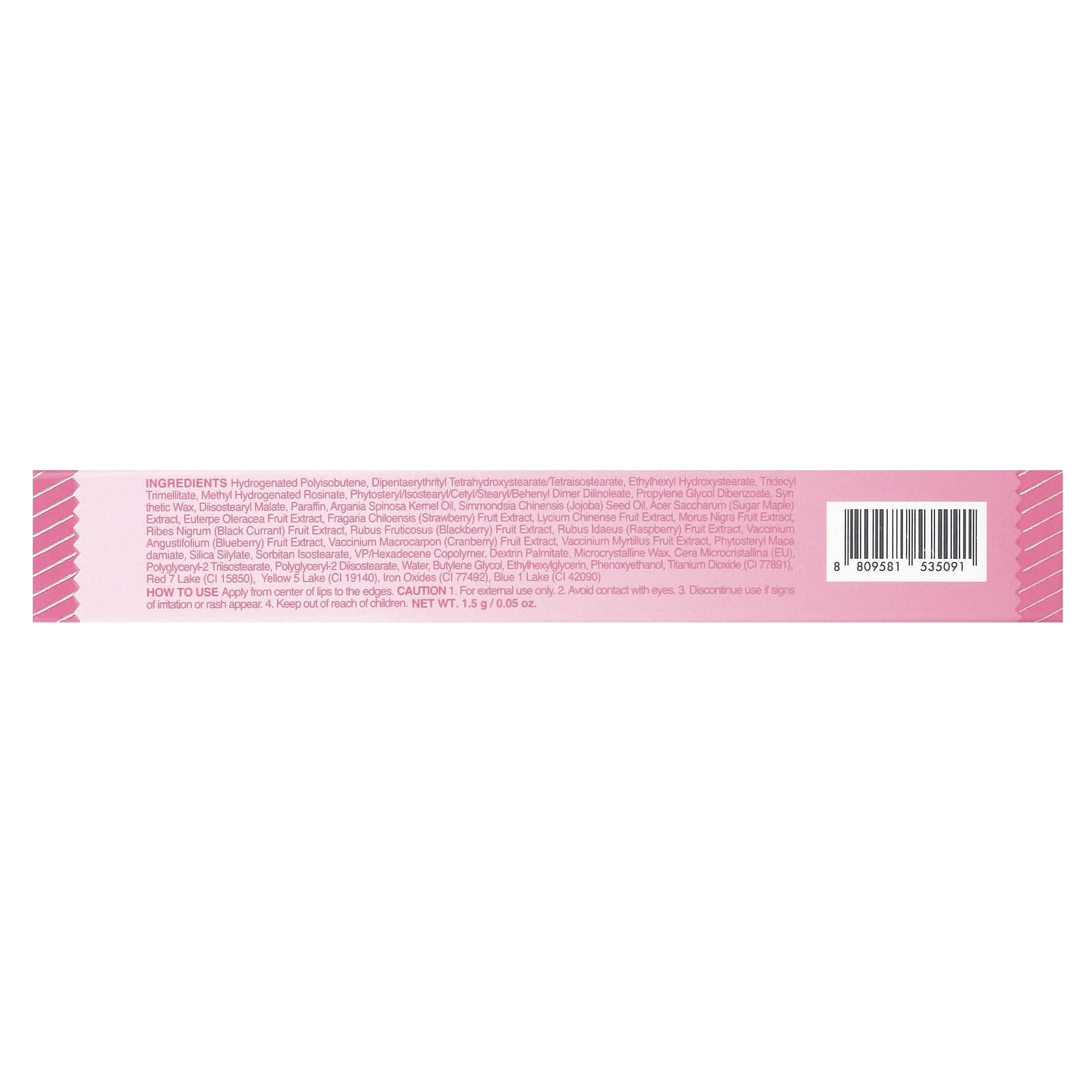 Гидрогенизированный полиизобутен, дипентаэритритил тетрагидроксистеарат / тетраизостеарат, этилгексил гидроксистеарат, тридецил тримеллитат, метилгидрогенизированная канифоль, фитостерил / изостеарил / цетил / стеарил / бегенил димер дилинолеат, пропиленгликоль дибензоат, синтетический воск, диизостеарил малат, парафин, масло из косточек аргании (Argania spinosa), масло семян жожоба (Simmondsia chinensis), экстракт сахарного клена (Acer saccharum), экстракт плодов эвтерпы масличной (Euterpe oleracea), экстракт плодов клубники (Fragaria chiloensis), экстракт плодов лициума китайского (Lycium chinense), экстракт плодов черного дерева, экстракт плодов черной смородины (Ribes nigrum), экстракт плодов ежевики (Rubus fruticosus), экстракт плодов малины (Rubus idaeus), экстракт плодов черники (Vaccinium angustifolium), экстракт плодов клюквы (Vaccinium macrocarpon), экстракт плодов Vaccinium myrtillus, фитостерил мака дамиат, силилат диоксида кремния, сорбитан изостеарат, ВП / гексадеценовый сополимер, декстрин пальмитат, микрокристаллический воск, Cera microcristallina (ЕС), полиглицерил-2 триизостеарат, полиглицерил-2 диизостеарат, вода, бутиленгликоль, этилгексилглицерин, феноксиэтанол, диоксид титана (CI 77891), красное озеро 7 (CI 15850), желтое 5 озеро (CI 19140), оксиды железа (CI 77492), голубое 1 озеро (CI 42090).