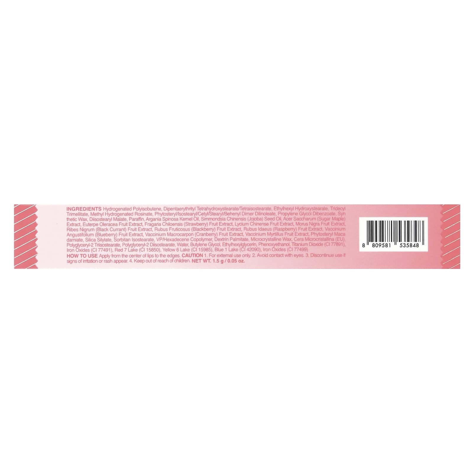 Гидрогенизированный полиизобутен, дипентаэритритил тетрагидроксистеарат / тетраизостеарат, этилгексил гидроксистеарат, тридецил тримеллитат, метилгидрогенизированная канифоль, фитостерил / изостеарил / цетил / стеарил / бегенил димер дилинолеат, пропиленгликоль дибензоат, синтетический воск, диизостеарил малат, парафин, масло из косточек аргании (Argania spinosa), масло семян жожоба (Simmondsia chinensis), экстракт сахарного клена (Acer saccharum), экстракт плодов эвтерпы масличной (Euterpe oleracea), экстракт плодов клубники (Fragaria chiloensis), экстракт плодов лициума китайского (Lycium chinense), экстракт плодов черного дерева, экстракт плодов черной смородины (Ribes nigrum), экстракт плодов ежевики (Rubus fruticosus), экстракт плодов малины (Rubus idaeus), экстракт плодов черники (Vaccinium angustifolium), экстракт плодов клюквы (Vaccinium macrocarpon), экстракт плодов Vaccinium myrtillus, фитостерил мака дамиат, силилат диоксида кремния, сорбитан изостеарат, ВП / гексадеценовый сополимер, декстрин пальмитат, микрокристаллический воск, полиглицерил-2 триизостеарат cera microcristallina (eu), полиглицерил-2 диизостеарат, вода, бутиленгликоль, этилгексилглицерин, феноксиэтанол, диоксид титана (CI 77891), оксиды железа (CI 77491), красное озеро 7 (CI 15850), желтый 6 лейк (CI 15985), голубое 1 озеро (CI 42090), оксиды железа (CI 77499).