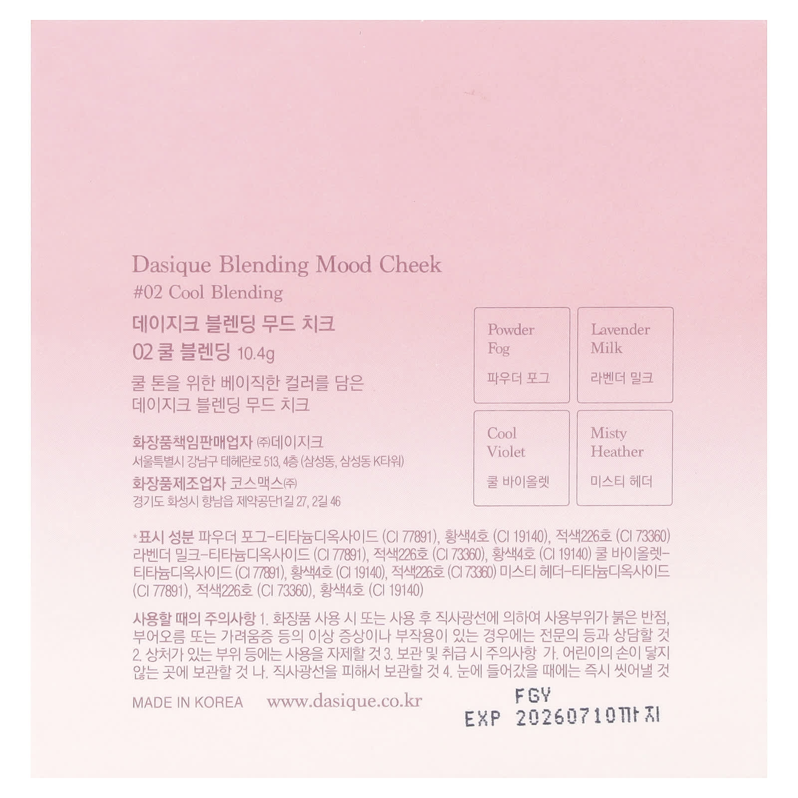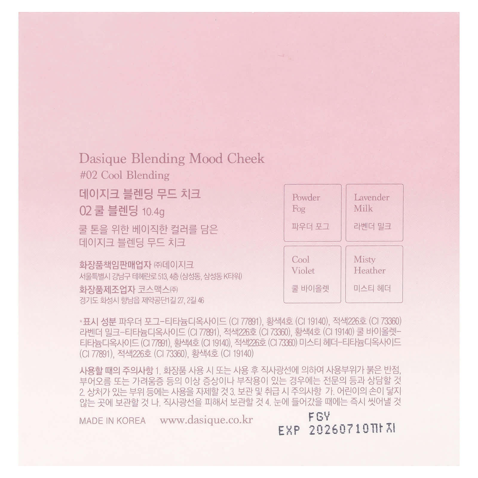 Холодный фиолетовый: Тальк, слюда (CI 77019), микрокристаллическая целлюлоза, диоксид кремния, ультрамарины (CI 77007), диметикон, алюминия крахмал октенилсукцинат, миристат магния, стеарат магния, цетил диметикон, октилдодецил стеароил стеарат, метилпропандиол, каолин, пропандиол, триэтоксикаприлилсилан, гидроксид алюминия, метикон, вода, диоксид титана (CI 77891), краситель темно-фиолетовый (CI 77742), краситель жёлтый 5 лак (CI 19140), краситель красный 30 (CI 73360).