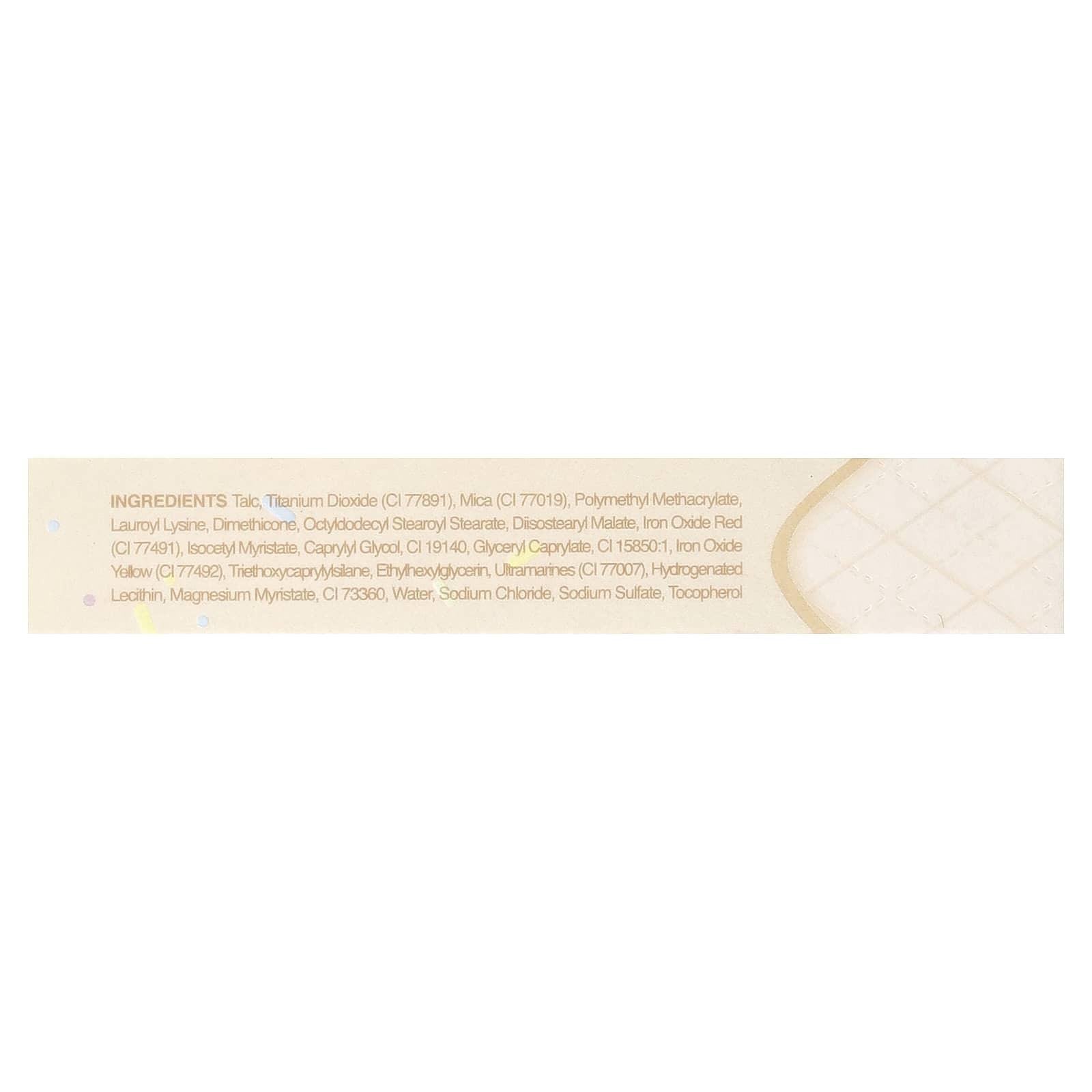 Тальк, диоксид титана (CI 77891), слюда (CI 77019), полиметилметакрилат, лаурил лизин, диметикон, октилдодецил стеароил стеарат, диизостеарил малат, оксид железа красный (CI 77491), изоцетил миристат, каприлилгликоль, CI 19140, глицерил каприлат, CI 15850:1, оксид железа жёлтый (CI 77492), триэтоксикаприлилсилан, этилгексилглицерин, ультрамарины (CI 77007), гидрогенизированный лецитин, миристат магния, CI 73360, вода, хлорид натрия, сульфат натрия, токоферол.