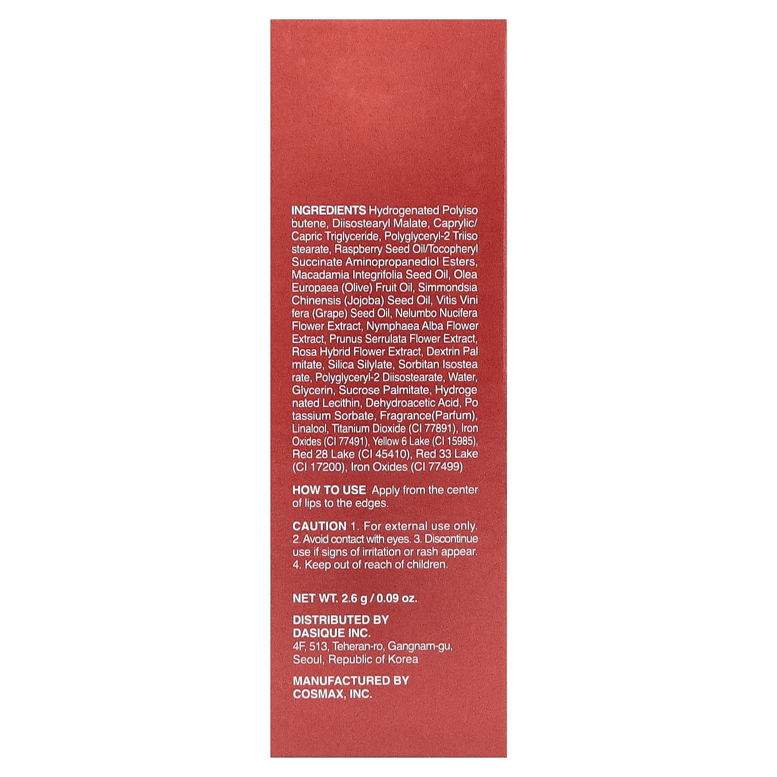 Гидрогенизированный полиизобутен, диизостеарил малат, каприловый/каприновый триглицерид, полиглицерил-2 триизостеарат, малиновое масло/токоферил сукцинат аминопропандиола, масло макадамии (Macadamia integrifolia), оливковое масло (Olea europaea), масло семян жожоба (Simmondsia chinensis), масло из виноградных косточек (Vitis vinifera), экстракт цветков лотоса орехоносного (Nelumbo nucifera), экстракт цветков кувшинки белой (Nymphaea alba), экстракт цветков вишни мелкопильчатой (Prunus serrulata), экстракт цветков розы (Rosa hybrida), декстрин пальмитат, силилат диоксида кремния, сорбитан изостеарат, полиглицерил-2 диизостеарат, вода, глицерин, пальмитат сахарозы, гидрогенизированный лецитин, дегидроуксусная кислота, сорбат калия, отдушка (парфюмерная композиция), линалоол, диоксид титана (CI 77891), оксиды железа (CI 77491), краситель желтый 6 лак (CI 15985), краситель красный 28 лак (CI 45410), краситель красный 33 лак (CI 17200), оксиды железа (CI 77499).