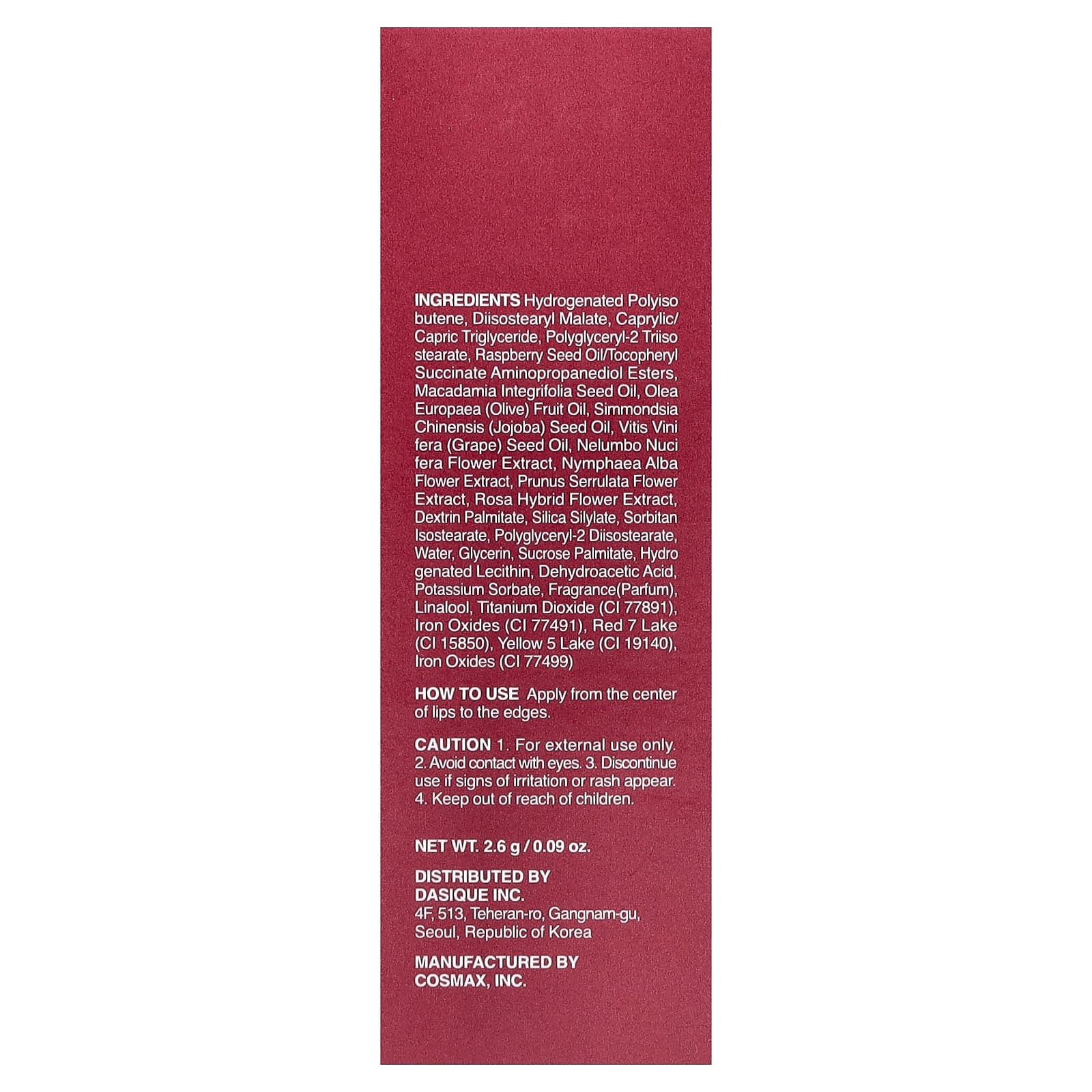 Гидрогенизированный полиизобутен, диизостеарил малат, каприловый/каприновый триглицерид, полиглицерил-2 триизостеарат, малиновое масло/токоферил сукцинат аминопропандиола, масло макадамии (Macadamia integrifolia), оливковое масло (Olea europaea), масло семян жожоба (Simmondsia chinensis), масло из виноградных косточек (Vitis vinifera), экстракт цветков лотоса орехоносного (Nelumbo nucifera), экстракт цветков кувшинки белой (Nymphaea alba), экстракт цветков вишни мелкопильчатой (Prunus serrulata), экстракт цветков розы (Rosa hybrida), декстрин пальмитат, силилат диоксида кремния, сорбитан изостеарат, полиглицерил-2 диизостеарат, вода, глицерин, пальмитат сахарозы, гидрогенизированный лецитин, дегидроуксусная кислота, сорбат калия, отдушка (отдушка) линалоол, диоксид титана (CI 77891), оксиды железа (CI 77491), краситель красный 7 лак (CI 15850), краситель жёлтый 5 лак (CI 19140), оксиды железа (CI 77499).