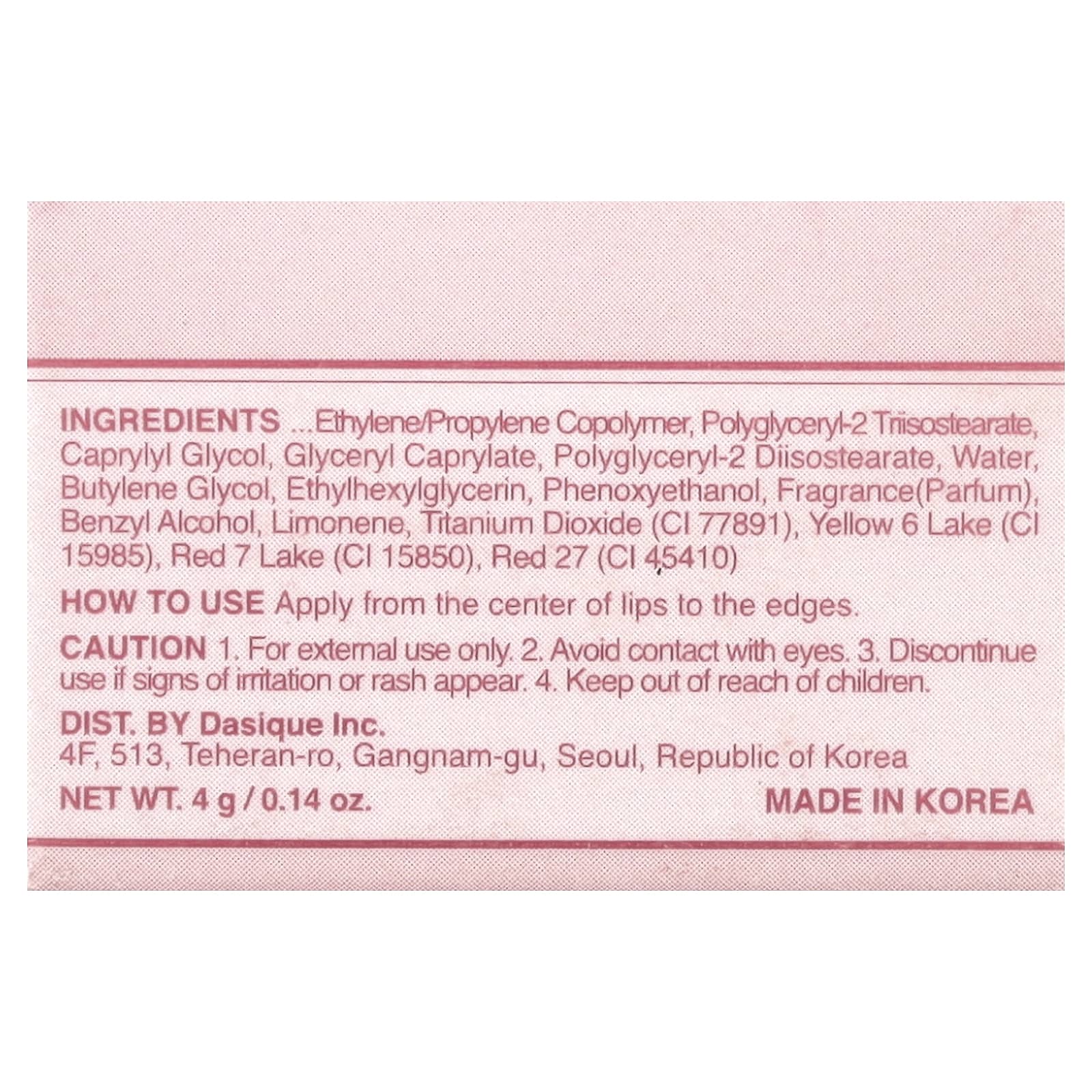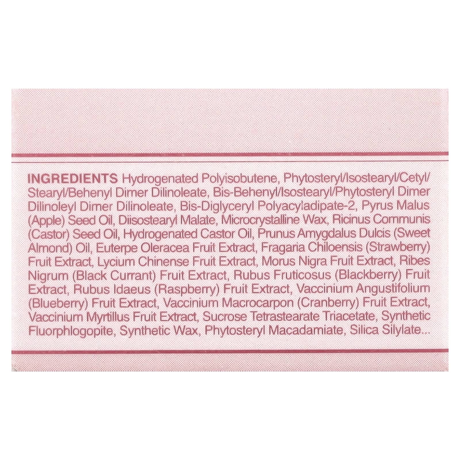 Гидрогенизированный полиизобутен, фитостерил/изостеарил/цетил/стеарил/бегенил димер дилинолеат, бис-бегенил/изостеарил/фитостерил димер дилинолеил димер дилинолеат, бис-диглицерил полиациладипат-2, масло косточек яблока (Pyrus malus), диизостеарил малат, микрокристаллический воск, касторовое масло (Ricinus communis), гидрогенизированное касторовое масло, масло сладкого миндаля (Prunus amygdalus dulcis), экстракт ягод асаи (Euterpe oleracea), экстракт ягод клубники (Fragaria chiloensis), экстракт ягод годжи (Lycium chinense), экстракт плодов черной шелковицы (Morus nigra), экстракт ягод черной смородины (Ribes nigrum), экстракт ягод ежевики (Rubus fructicosus), экстракт ягод малины (Rubus idaeus), экстракт ягод голубики (Vaccinium angustifolium), экстракт ягод клюквы (Vaccinium macrocarpon), экстракт ягод черники (Vaccinium myrtillus), тетрастеарат триацетат сахарозы, синтетический фторфлогопит, синтетический воск, фитостерил макадамиат, силилат диоксида кремния, сополимер этилена/пропилена, полиглицерил-2 триизостеарат, каприлилгликоль, глицерил каприлат, полиглицерил-2 диизостеарат, вода, бутиленгликоль, этилгексилглицерин, феноксиэтанол, отдушка (отдушка) бензиловый спирт, лимонен, диоксид титана (CI 77891), краситель желтый 6 лак (CI 15985), краситель красный 7 лак (CI 15850), краситель красный 27 (CI 45410).