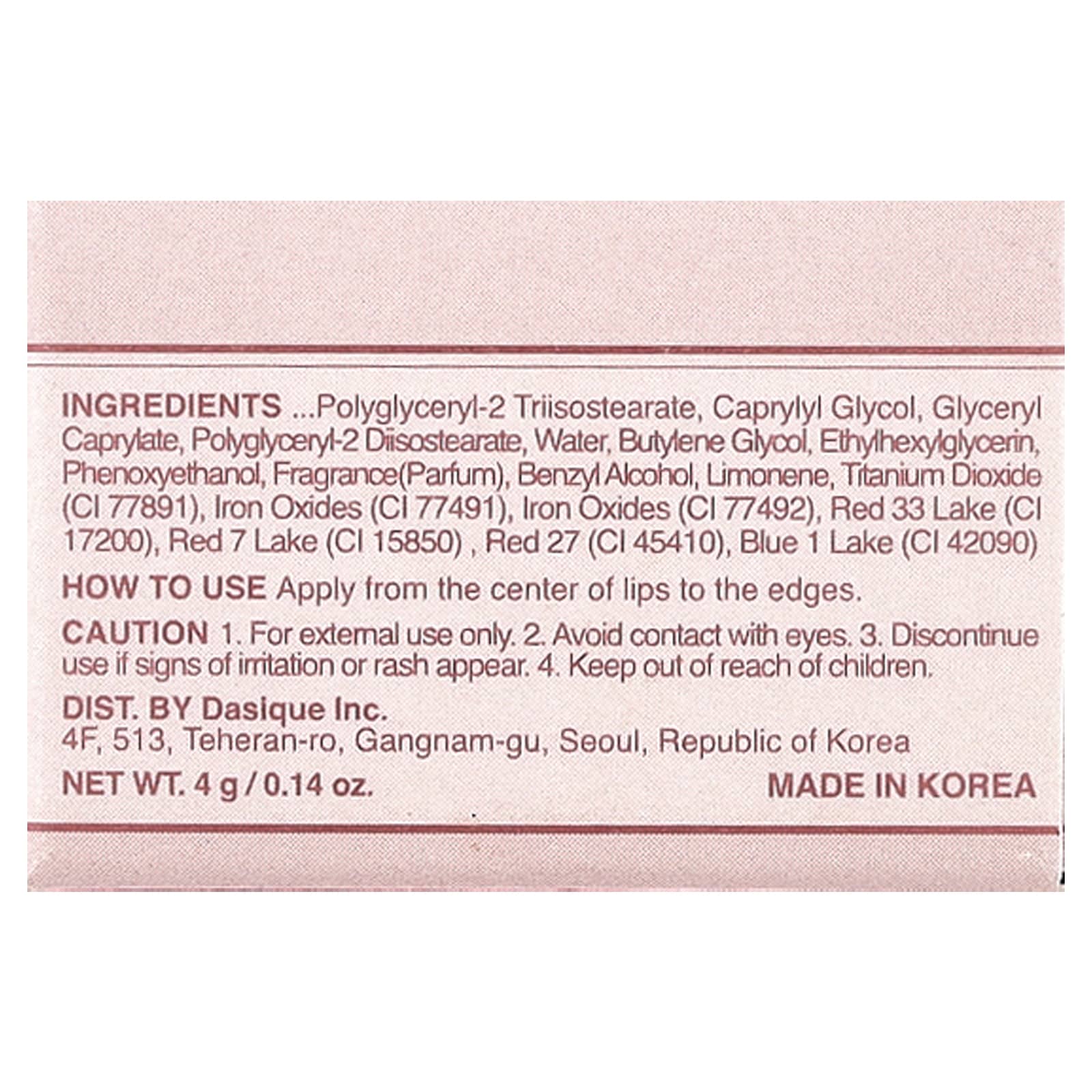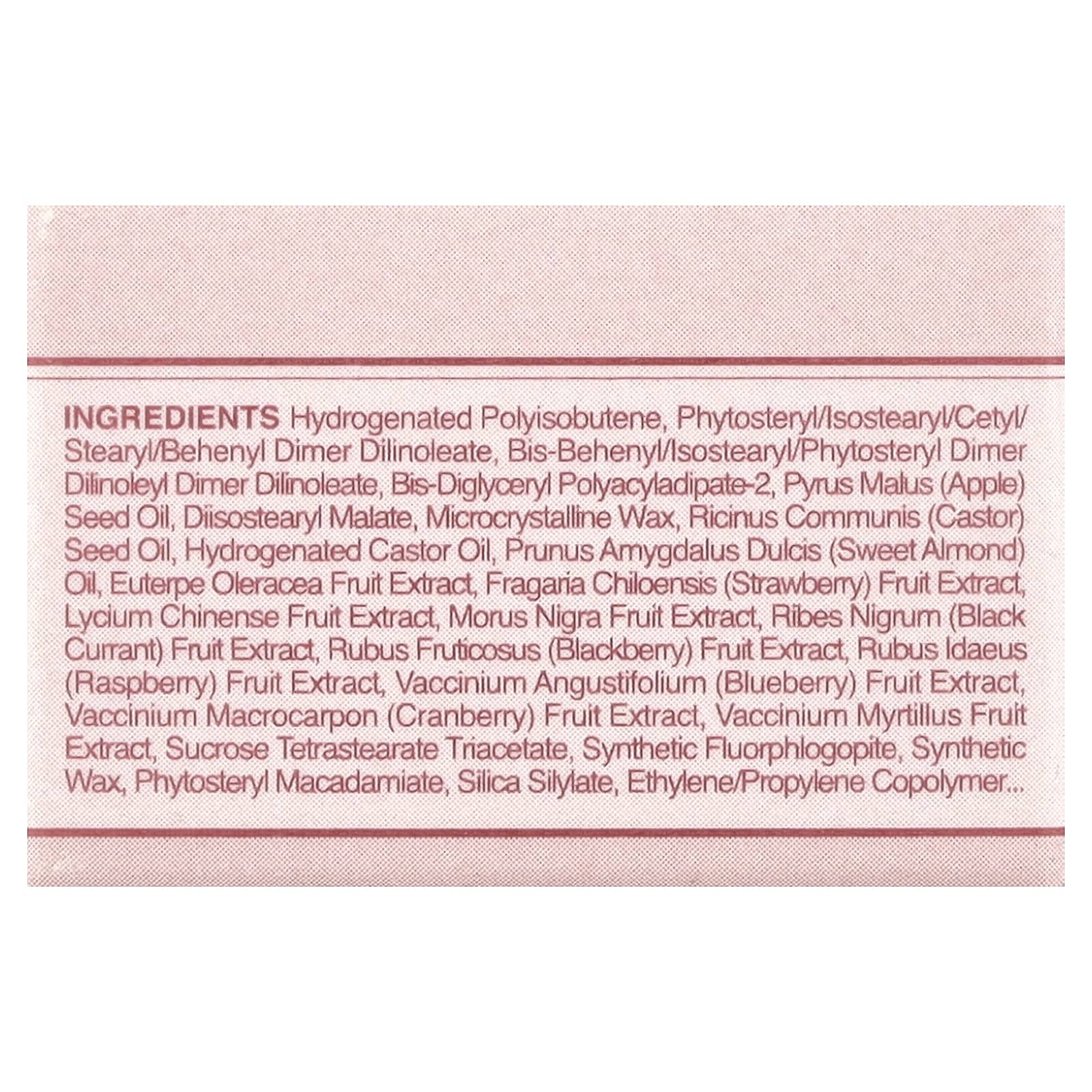 Гидрогенизированный полиизобутен, фитостерил/изостеарил/цетил/стеарил/бегенил димер дилинолеат, бис-бегенил/изостеарил/фитостерил димер дилинолеил димер дилинолеат, бис-диглицерил полиациладипат-2, масло косточек яблока (Pyrus malus), диизостеарил малат, микрокристаллический воск, касторовое масло (Ricinus communis), гидрогенизированное касторовое масло, масло сладкого миндаля (Prunus amygdalus dulcis), экстракт ягод асаи (Euterpe oleracea), экстракт ягод клубники (Fragaria chiloensis), экстракт ягод годжи (Lycium chinense), экстракт плодов черной шелковицы (Morus nigra), экстракт ягод черной смородины (Ribes nigrum), экстракт ягод ежевики (Rubus fructicosus), экстракт ягод малины (Rubus idaeus), экстракт ягод голубики (Vaccinium angustifolium), экстракт ягод клюквы (Vaccinium macrocarpon), экстракт ягод черники (Vaccinium myrtillus), тетрастеарат триацетат сахарозы, синтетический фторфлогопит, синтетический воск, фитостерил макадамиат, силилат диоксида кремния, сополимер этилена/пропилена, полиглицерил-2 триизостеарат, каприлилгликоль, глицерил каприлат, полиглицерил-2 диизостеарат, вода, бутиленгликоль, этилгексилглицерин, феноксиэтанол, отдушка (парфюмерная композиция), бензиловый спирт, лимонен, диоксид титана (CI 77891), оксиды железа (CI 77491), оксиды железа (CI 77492), краситель красный 33 лак (CI 17200), краситель красный 7 лак (CI 15850) , краситель красный 27 (CI 45410), краситель синий 1 лак (CI 42090).