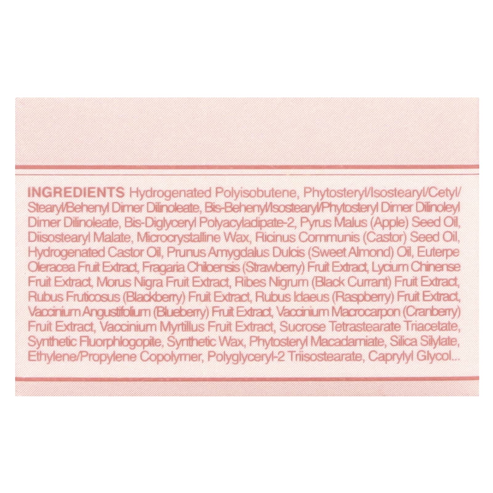 Гидрогенизированный полиизобутен, фитостерил / изостеарил / цетил / стеарил / бегенил димер дилинолеат, бис-бегенил / изостеарил / фитостерил димер дилинолеат, димер дилинолеат, бис-диглицерил полиациладипат-2, масло из семян яблока (Pyrus malus), диизостеарил малат, микрокристаллический воск, касторовое масло (Ricinus communis), гидрогенизированное касторовое масло, масло сладкого миндаля (Prunus amygdalus dulcis), экстракт плодов эвтерпы масличной (Euterpe oleracea), экстракт плодов клубники (Fragaria chiloensis), экстракт плодов лициума китайского (Lycium chinense), экстракт плодов черного дерева, экстракт плодов черной смородины (Ribes nigrum), экстракт плодов ежевики (Rubus fruticosus), экстракт плодов малины (Rubus idaeus), экстракт плодов черники (Vaccinium angustifolium), экстракт плодов клюквы (Vaccinium macrocarpon), экстракт плодов Vaccinium myrtillus, тетрастеарат триацетат сахарозы синтетический фторфлогопит, синтетический воск, фитостерил макадамат, силилат диоксида кремния, сополимер этилена и пропилена, полиглицерил-2 триизостеарат, каприлилгликольглицерил каприлат, полиглицерил-2 диизостеарат, вода, бутиленгликоль, этилгексилглицерин, феноксиэтанол, отдушка (парфюмерная композиция), бензиловый спирт, лимонен, желтое 5 озеро (CI 19140), красный 6 (Cl 15850), диоксид титана (CI 77891), красное дерево 28 лейк (CI 45410), оксиды железа (CI 77491), красный 27 (Cl 45410), красное озеро 7 (CI 15850).
