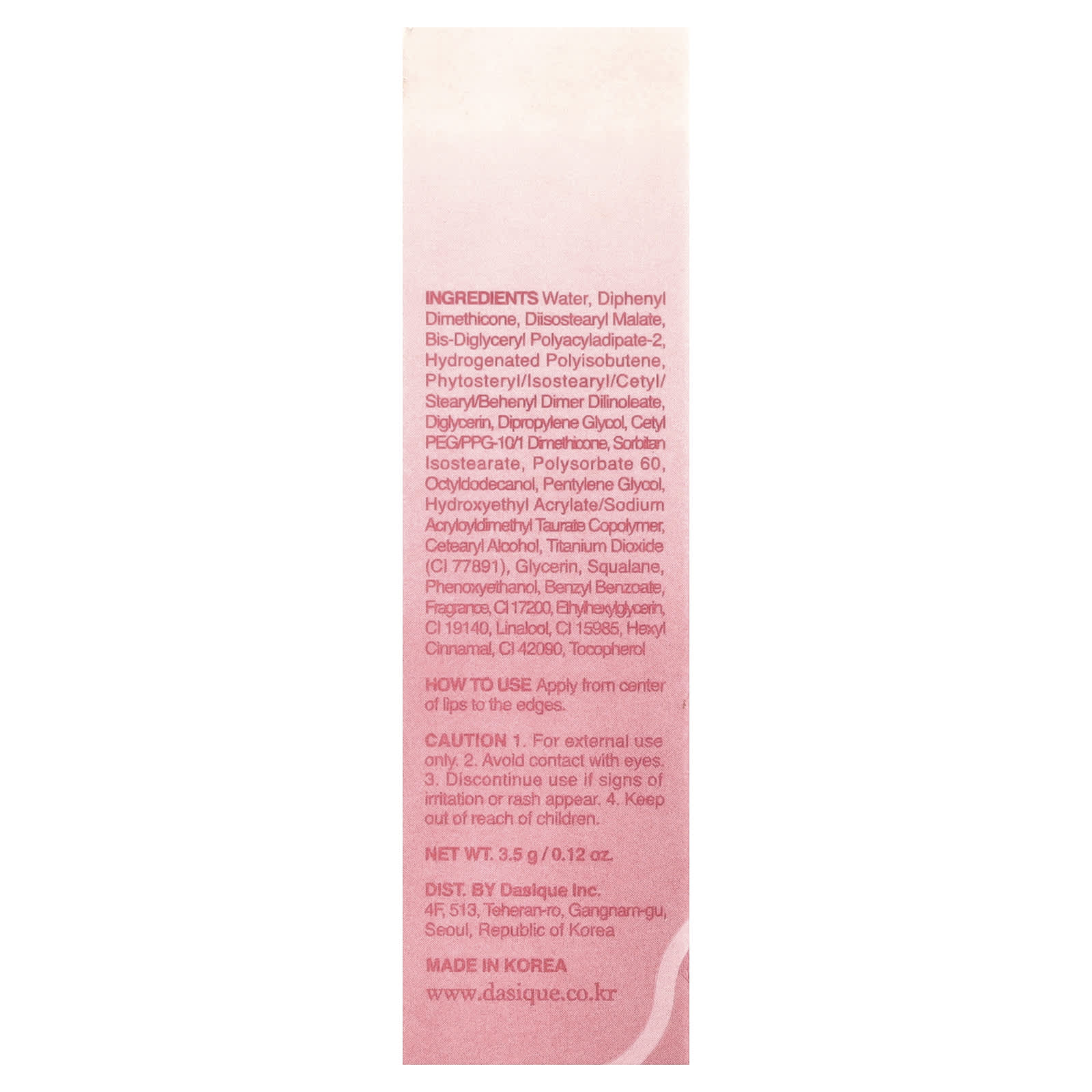 Вода, дифенил диметикон, диизостеарил малат, бис-диглицерил полиациладипат-2, гидрогенизированный полиизобутен, фитостерил/изостеарил/цетил/стеарил/бегенил димер дилинолеат, диглицерин, дипропиленгликоль, цетил ПЭГ/ППГ-10/1 диметикон, сорбитан изостеарат, полисорбат 60 октилдодеканол, пентилен гликоль, гидроксиэтил акрилат/натрия акрилоилдиметилтаурата сополимер, цетеариловый спирт, диоксид титана (CI 77891), глицерин, сквалан феноксиэтанол, бензилбензоат отдушка, CI 17200, этилгексилглицин, CI 19140, линалоол, CI 15985, гексил циннамал, CI 42090, токоферол.