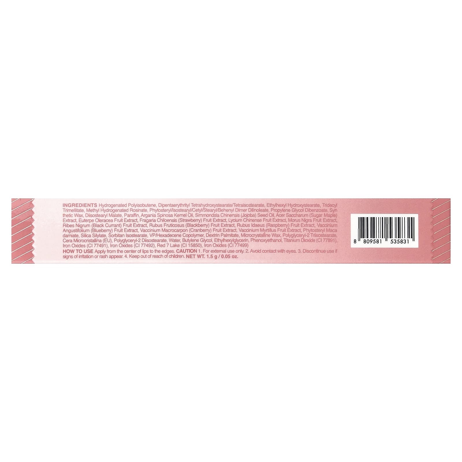 Гидрогенизированный полиизобутен, дипентаэритритил тетрагидроксистеарат/тетраизостеарат, этилгексил гидроксистеарат, тридецил тримеллитат, метил-гидрогенизированный розинат, фитостерил / изостеарил / цетил / стеарил / бегенил димер дилинолеат, пропиленгликоль дибензоат, синтетический воск, диизостеарил малат, парафина, аргановое масло (Argania spinosa), масло из семян жожоба (Simmondsia chinensis), экстракт сахарного клёна (Acer saccharum), экстракт ягод асаи (Euterpe oleracea), экстракт ягод клубники (Fragaria chiloensis), экстракт ягод годжи (Lycium chinense), экстракт плодов черной шелковицы (Morus nigra), экстракт ягод черной смородины (Ribes nigrum), экстракт ягод ежевики (Rubus fructicosus), экстракт ягод малины (Rubus idaeus), экстракт ягод голубики (Vaccinium angustifolium), экстракт ягод клюквы (Vaccinium macrocarpon), экстракт ягод черники (Vaccinium myrtillus), фитостерил макадамиат, силилат диоксида кремния, сорбитан изостеарат, ВП/гексадецен сополимер, декстрин пальмитат, микрокристаллический воск, полиглицерил-2 триизостеарат, микрокристаллический кремний (Cera микрокристаллический), полиглицерил-2 диизостеарат, вода, бутиленгликоль, этилгексилглицерин, феноксиэтанол, диоксид титана (CI 77891), оксиды железа (CI 77491), оксиды железа (CI 77492), краситель красный 7 лак (CI 15850), оксиды железа (CI 77499).