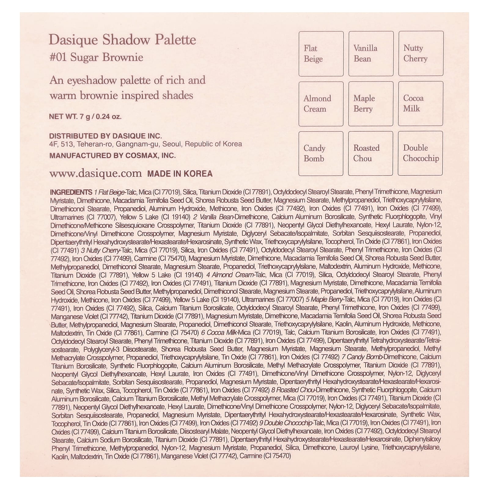 Двойной шоколадный чипс: Тальк, слюда (CI 77019), оксиды железа (CI 77491), оксиды железа (CI 77499), боросиликат кальция и титана, диизостеарил малат, неопентилгликоль диэтилгексаноат, оксиды железа (CI 77492), октилдодецил стеароил стеарат, кальций натрий боросиликат, диоксид титана (CI 77891), дипентаэритритил гексагидроксистеорат/гексастерат/гексаросинат, дифенил силокси фенилтриметикон, метилпропандиол, нейлон-12, миристат магния, пропандиол, диоксид кремния, диметикон, лаурил лизин, триэтоксикаприлилсилан, каолин, мальтодекстрин, оксид олова (CI 77861), краситель темно-фиолетовый (CI 77742), кармин (CI 75470).