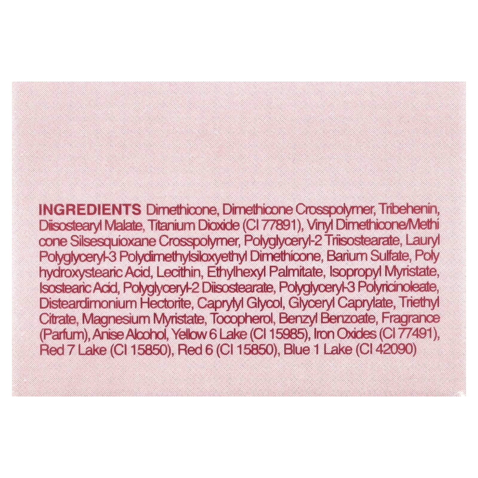 Диметикон, диметикон кроссполимер, трибехенин, дистеарил малат, диоксид титана (CI 77891), винил диметикон/метикон силсесквиоксан кроссполимер, полиглицерил-2 триизостеарат, лаурилполиглицерил-3-полидиметилсилоксиэтилдиметикон, сульфат бария, полигидроксистеариновая кислота, лецитин, этилгексил пальмитат, изопропил миристат, изостеариновая кислота, полиглицерил-2 диизостеарат, полиглицерил-3-полирицинолеат, дистеардимония гекторит, каприлилгликоль, глицерил каприлат, триэтилцитрат, миристат магния, токоферол, бензилбензоат, отдушка (парфюмерная композиция), анисовый спирт, краситель желтый 6 лак (CI 15985), оксиды железа (CI 77491), краситель красный 7 лак (CI 15850), краситель красный 6 (CI 15850), краситель синий 1 лак (CI 42090).