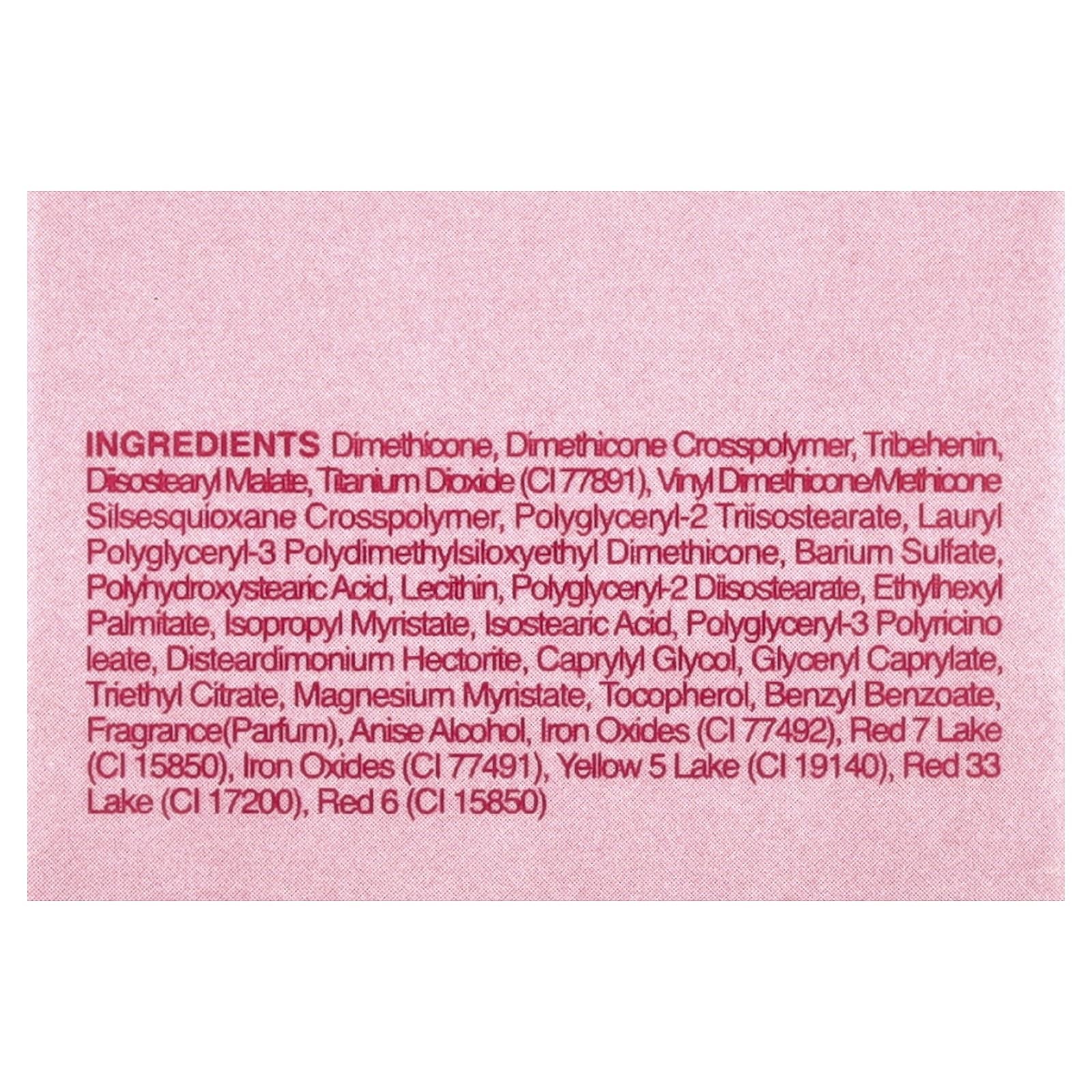 Диметикон, диметикон кроссполимер, трибехенин, дистеарил малат, диоксид титана (CI 77891), винил диметикон/метикон силсесквиоксан кроссполимер, полиглицерил-2 триизостеарат, лаурилполиглицерил-3-полидиметилсилоксиэтилдиметикон, сульфат бария, полигидроксистеариновая кислота, лецитин, полиглицерил-2 диизостеарат, этилгексил пальмитат, изопропил миристат, изостеариновая кислота, полиглицерил-3-полирицинолеат, дистеардимония гекторит, каприлилгликоль, глицерил каприлат, триэтилцитрат, миристат магния, токоферол, бензилбензоат, отдушка (парфюмерная композиция), анисовый спирт, оксиды железа (CI 77492), краситель красный 7 лак (CI 15850), оксиды железа (CI 77491), краситель жёлтый 5 лак (CI 19140), краситель красный 33 лак (CI 17200), краситель красный 6 (CI 15850).