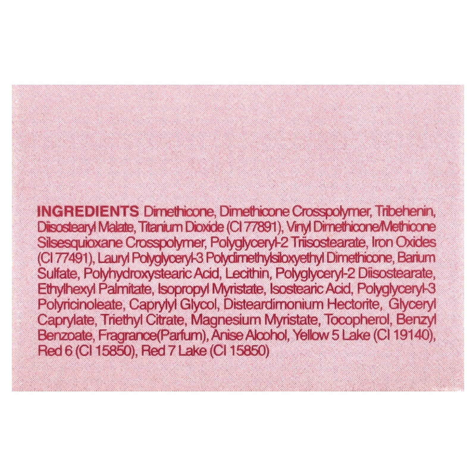 Диметикон, диметикон кроссполимер, трибехенин, дистеированный малат, диоксид тиана (CI 77891), диметиконмаркон сизесквиоксана кроссполимер, полволицерил-2 тризостеарат, оксиды железа (C) 77491), лаурил повойцери-3 польдименисибксиэтил диметикон, баум сульфат, полигидроксисиариновая кислота, лецитин, полиглицерил 2 дисстеарат, эгигексил пальмитат, изопропил миристат, изостеариновая кислота, полиглицерий3 полирицинолеат, каприлилгликоль, дистеардимония гекторит, глицерил каприиат, триэтилцитрат, миристат магния, токоферол, бензилбензоат, отдушка (парфюмерная композиция), анисовый спирт, краситель желтый 5 лак (C) 19140). краситель красный 6 (C) 15850), краситель красный 7 лак (C) 15850).