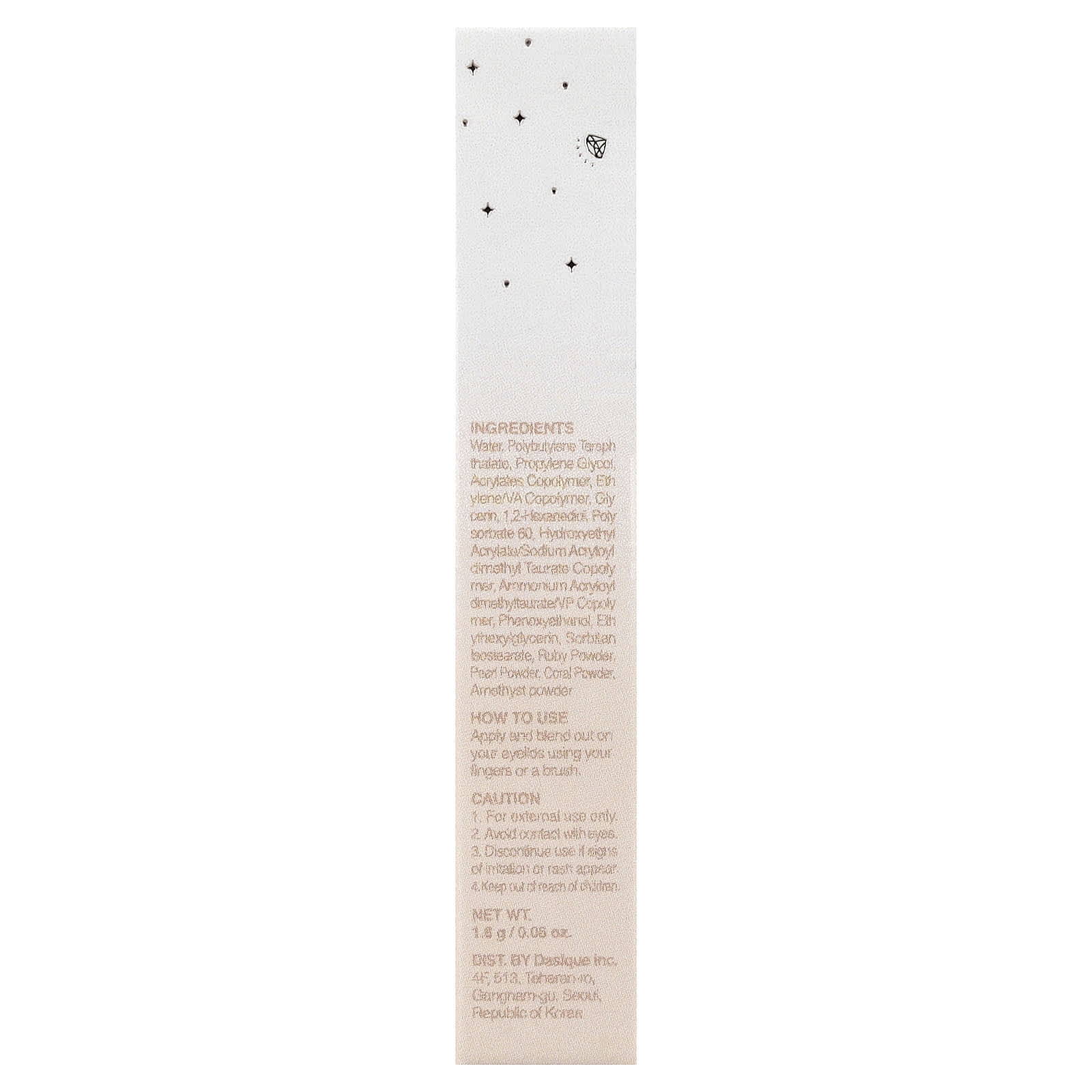 Вода, полибутилентерефталат, пропиленгликоль, сополимер акрилатов, сополимер этилена/ВА, глицерин, 1,2-гександиол, полисорбат 60, гидроксиэтил акрилат/натрия акрилоилдиметилтаурата сополимер, аммоний акрилоилдиметилтаурат/ВП сополимер, феноксиэтанол, этилгексилглицерин, сорбитан изостеарат, рубиновый порошок, жемчужный порошок, коралловый порошок, аметистовый порошок.