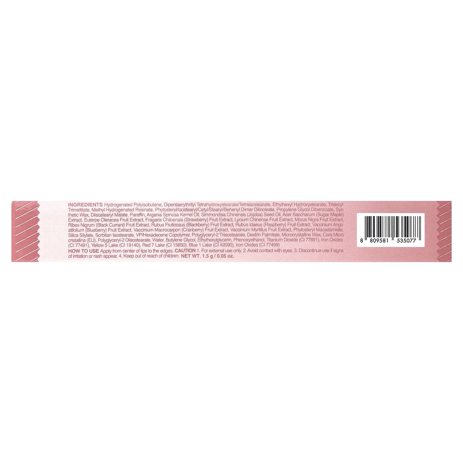 Гидрогенизированный полиизобутен, дипентаэритритил тетрагидроксистеарат/тетраизостеарат, этилгексил гидроксистеарат, тридецил тримеллитат, метил-гидрогенизированный розинат, фитостерил / изостеарил / цетил / стеарил / бегенил димер дилинолеат, пропиленгликоль дибензоат, синтетический воск, диизостеарил малат, парафина, аргановое масло (Argania spinosa), масло из семян жожоба (Simmondsia chinensis), экстракт сахарного клёна (Acer saccharum), экстракт ягод асаи (Euterpe oleracea), экстракт ягод клубники (Fragaria chiloensis), экстракт ягод годжи (Lycium chinense), экстракт плодов черной шелковицы (Morus nigra), экстракт ягод черной смородины (Ribes nigrum), экстракт ягод ежевики (Rubus fructicosus), экстракт ягод малины (Rubus idaeus), экстракт ягод голубики (Vaccinium angustifolium), экстракт ягод клюквы (Vaccinium macrocarpon), экстракт ягод черники (Vaccinium myrtillus), фитостерил макадамиат, силилат диоксида кремния, сорбитан изостеарат, ВП/гексадецен сополимер, полиглицерил-2 триизостеарат, декстрин пальмитат, микрокристаллический воск, микрокристаллический кремний (Cera микрокристаллический), полиглицерил-2 диизостеарат, вода, бутиленгликоль, этилгексилглицерин, феноксиэтанол, диоксид титана (CI 77891), оксиды железа (CI 77491), краситель жёлтый 5 лак (CI 19140), краситель красный 7 лак (CI 15850), краситель синий 1 лак (CI 42090), оксиды железа (CI 77499).
