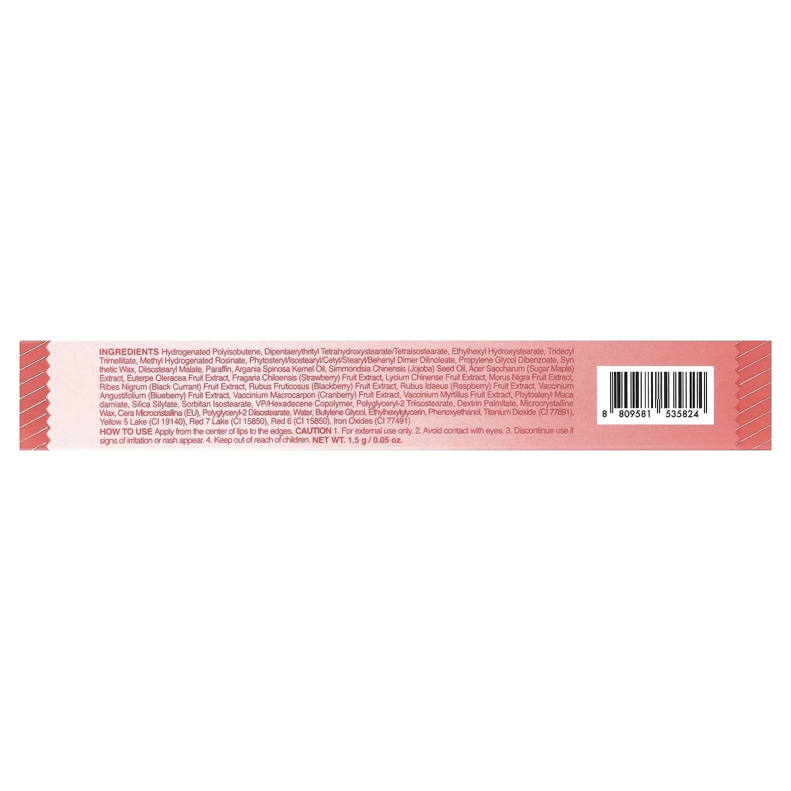 Гидрогенизированный полиизобутен, дипентаэритритил тетрагидроксистеарат/тетраизостеарат, этилгексил гидроксистеарат, тридецил тримеллитат, метил-гидрогенизированный розинат, фитостерил / изостеарил / цетил / стеарил / бегенил димер дилинолеат, пропиленгликоль дибензоат, синтетический воск, диизостеарил малат, парафина, аргановое масло (Argania spinosa), масло из семян жожоба (Simmondsia chinensis), экстракт сахарного клёна (Acer saccharum), экстракт ягод асаи (Euterpe oleracea), экстракт ягод клубники (Fragaria chiloensis), экстракт ягод годжи (Lycium chinense), экстракт плодов черной шелковицы (Morus nigra), экстракт ягод черной смородины (Ribes nigrum), экстракт ягод ежевики (Rubus fructicosus), экстракт ягод малины (Rubus idaeus), экстракт ягод голубики (Vaccinium angustifolium), экстракт ягод клюквы (Vaccinium macrocarpon), экстракт ягод черники (Vaccinium myrtillus), фитостерил макадамиат, силилат диоксида кремния, сорбитан изостеарат, ВП/гексадецен сополимер, полиглицерил-2 триизостеарат, декстрин пальмитат, микрокристаллический воск, микрокристаллический кремний (Cera микрокристаллический), полиглицерил-2 диизостеарат, вода, бутиленгликоль, этилгексилглицерин, феноксиэтанол, диоксид титана (CI 77891), краситель жёлтый 5 лак (CI 19140), краситель красный 7 лак (CI 15850), краситель красный 6 (CI 15850), оксиды железа (CI 77491).