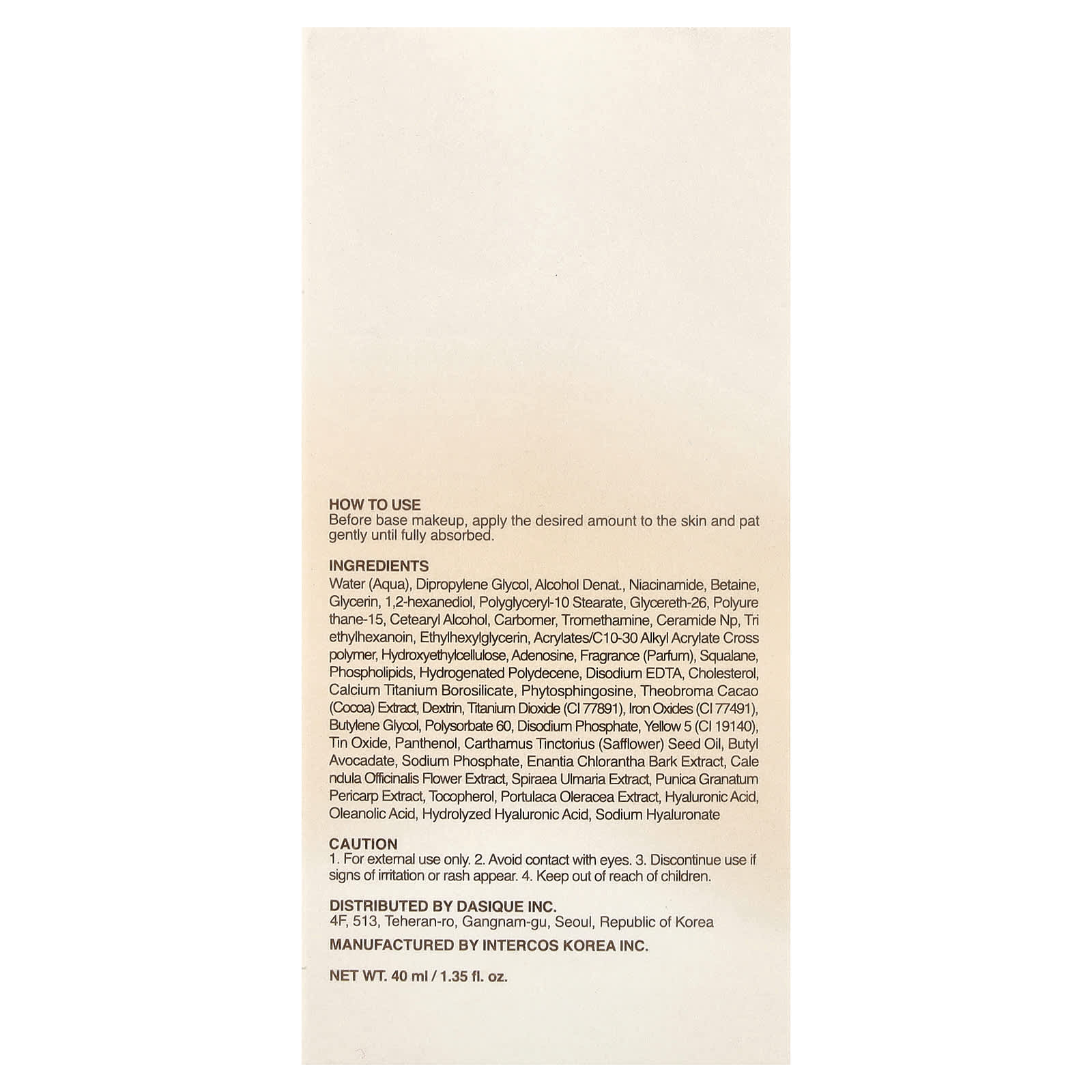 Вода, дипропиленгликоль, денатурированный спирт, никотинамид, бетаин, глицерин, 1,2-гександиол, полиглицерил-10 стеарат, глицерет-26, полиуретан-15, цетеариловый спирт, карбомер, трометамин, керамид NP, триэтилгексаноин, этилгексилглицерин, акрилат/c10-30 алкил акрилат кроссполимер, гидроксиэтилцеллюлоза, аденозин, отдушка (парфюмерная композиция), сквалан, фосфолипидов, гидрогенизированный полидецен, двунатриевая ЭДТК, холестерина, боросиликат кальция и титана, фитосфингозин, экстракт какао (Theobroma cacao), декстрин, диоксид титана (CI 77891), оксиды железа (CI 77491), бутиленгликоль, полисорбат 60, динатрия фосфат, краситель жёлтый 5 (CI 19140), оксид олова, пантенол, масло семян сафлора (Carthamus tinctorius), бутил авокадат, фосфат натрия, экстракт коры африканского дерева Энантия (Enantia chlorantha), экстракт цветков календулы (Calendula officinalis), экстракт таволги (Spiraea ulmaria), экстракт околоплодника (Punica granatum), токоферол, экстракт портулака огородного (Portulaca oleracea), гиалуроновая кислота, олеаноловая кислота, гидролизованная гиалуроновая кислота, гиалуронат натрия.