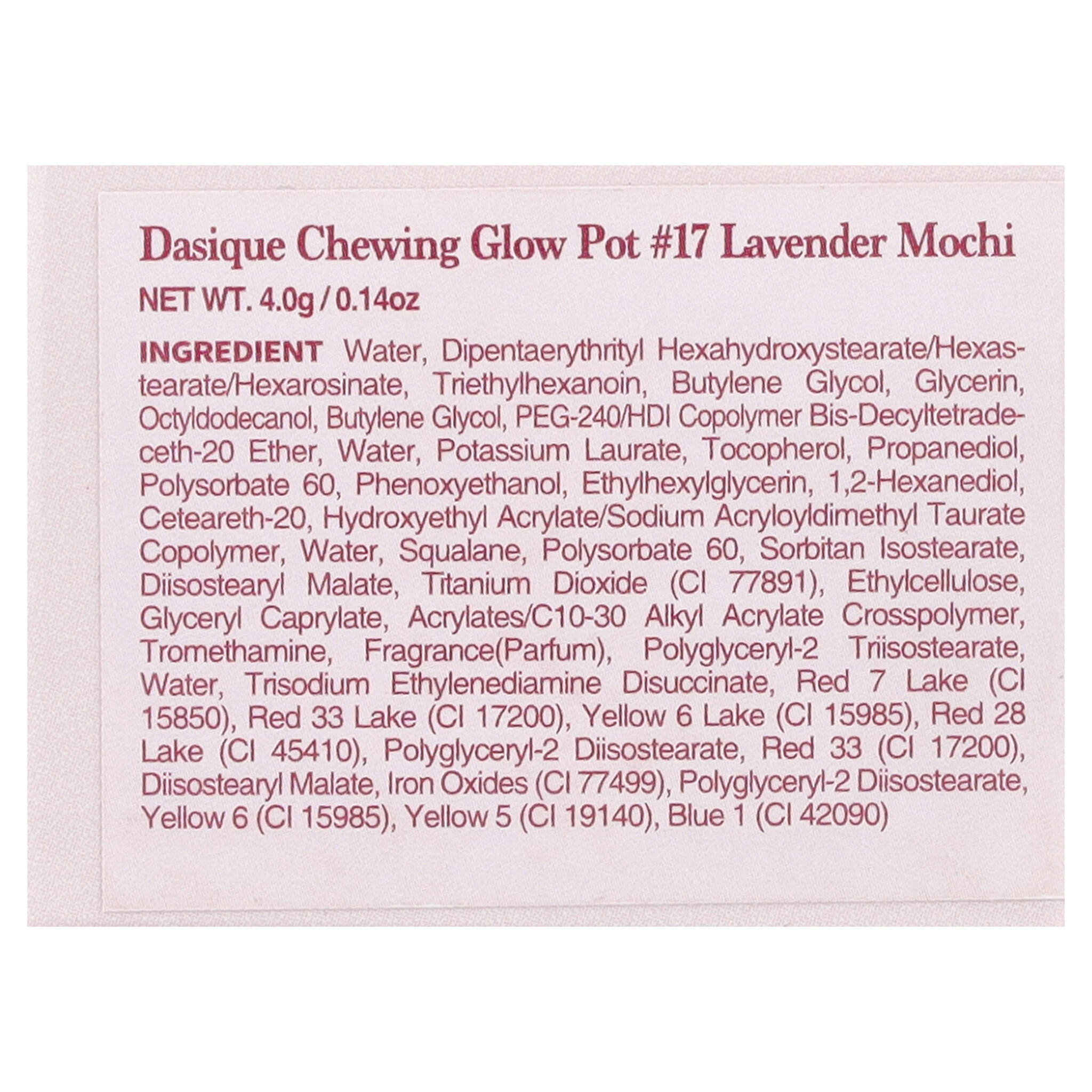 Вода, дипентаэритритил гексагидроксистеорат/гексастерат/гексаросинат, триэтилгексаноин, бутиленгликоль, глицерин, октилдодеканол, бутиленгликоль, ПЭГ-240/HDI сополимер бис-децилтетрадецет-20 эфир, вода, лаурат калия, токоферол, пропандиол, полисорбат 60, феноксиэтанол, этилгексилглицерин, 1,2-гександиол, цетеарет-20, гидроксиэтил акрилат/натрия акрилоилдиметилтаурата сополимер, вода, сквалан, полисорбат 60, сорбитан изостеарат, диизостеарил малат, диоксид титана (CI 77891), этилцеллюлоза, глицерил каприлат, акрилат/c10-30 алкил акрилат кроссполимер, трометамин, отдушка (парфюмерная композиция), полиглицерил-2 триизостеарат, вода, тринатрия этилендиамин дисукцинат, краситель красный 7 лак (CI 15850), краситель красный 33 лак (CI 17200), краситель желтый 6 лак (CI 15985), краситель красный 28 лак (CI 45410), полиглицерил-2 диизостеарат, краситель красный 33 (CI 17200), диизостеарил малат, оксиды железа (CI 77499), полиглицерил-2 диизостеарат, краситель желтый 6 (CI 15985), краситель жёлтый 5 (CI 19140), краситель синий 1 (CI 42090).