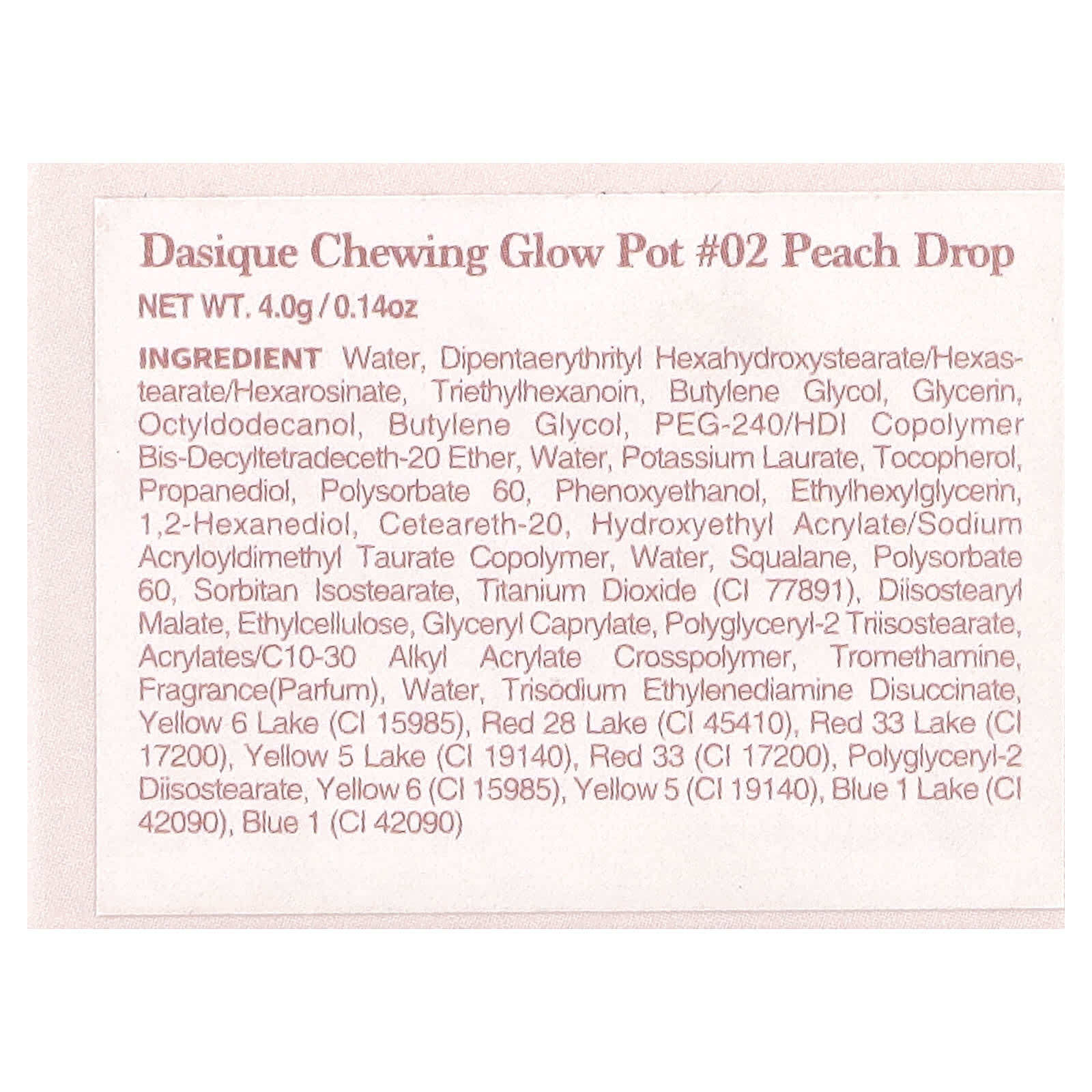 Вода, дипентаэритритил гексагидроксистеорат/гексастерат/гексаросинат, триэтилгексаноин, бутиленгликоль, глицерин, октилдодеканол, бутиленгликоль, ПЭГ-240/HDI сополимер бис-децилтетрадецет-20 эфир, вода, лаурат калия, токоферол, пропандиол, полисорбат 60, феноксиэтанол, этилгексилглицерин, 1,2-гександиол, цетеарет-20, гидроксиэтил акрилат/натрия акрилоилдиметилтаурата сополимер, вода, сквалан, полисорбат 60, сорбитан изостеарат, диоксид титана (CI 77891), диизостеарил малат, этилцеллюлоза, глицерил каприлат, полиглицерил-2 триизостеарат, акрилат/c10-30 алкил акрилат кроссполимер, трометамин, отдушка (парфюмерная композиция), вода, тринатрия этилендиамин дисукцинат, краситель желтый 6 лак (CI 15985), краситель красный 28 лак (CI 45410), краситель красный 33 лак (CI 17200), краситель жёлтый 5 лак (CI 19140), краситель красный 33 (CI 17200), полиглицерил-2 диизостеарат, краситель желтый 6 (CI 15985), краситель жёлтый 5 (CI 19140), краситель синий 1 лак (CI 42090), краситель синий 1 (CI 42090).