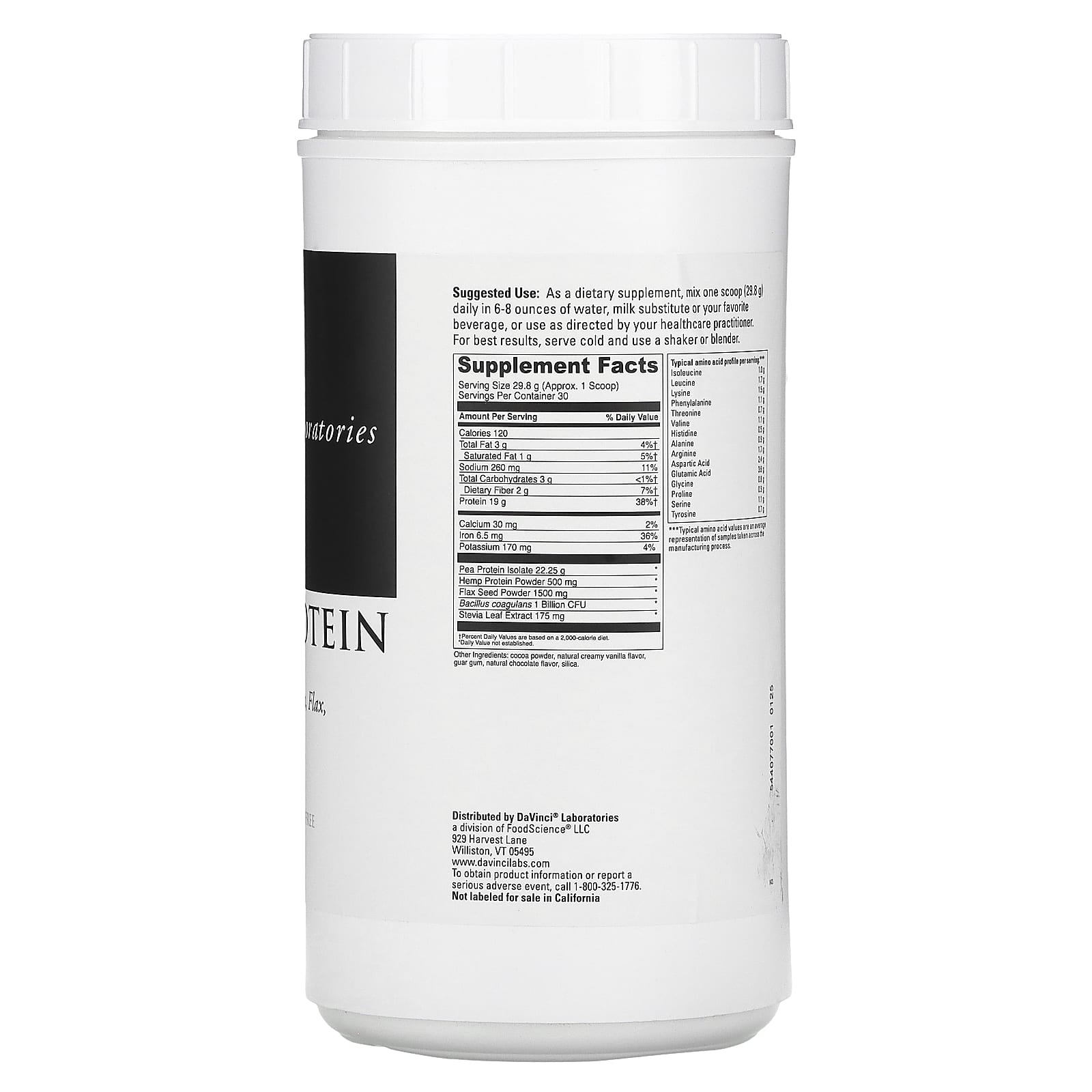 Веганский протеин «Сливочный шоколад» содержит 19 г протеина из гороха, семян льна и конопли. Каждая порция также содержит 1 миллиард КОЕ Bacillus coagulans.