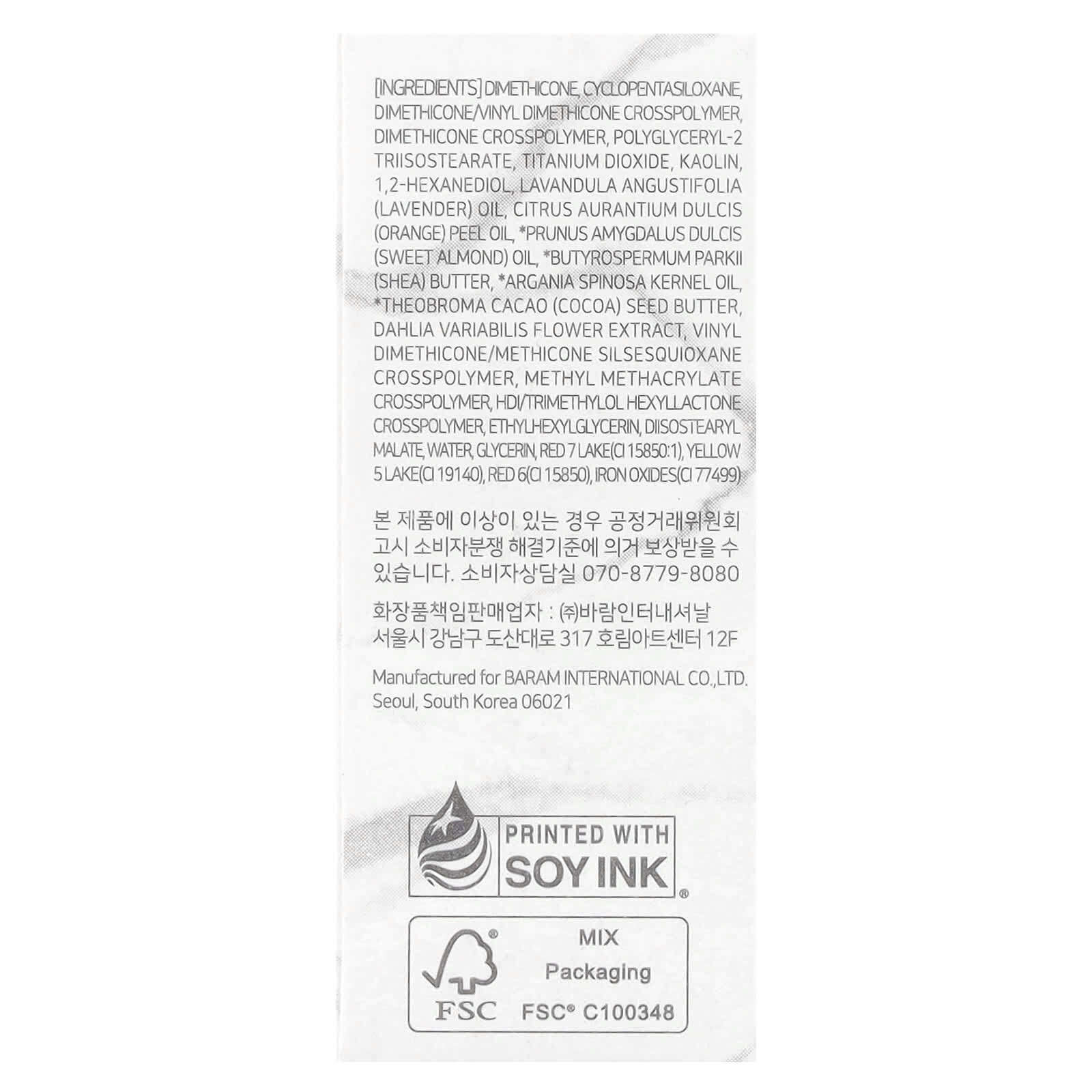 диметикон, циклопентасилоксан, диметикон/винил диметикон кроссполимер, диметикон кроссполимер, полиглицерил-2 триизостеарат, диоксид титана, каолин, 1,2-гександиол, лавандовое масло (Lavandula angustifolia), масло из цедры апельсина (Citrus aurantium dulcis), масло сладкого миндаля (Prunus amygdalus dulcis), масло ши (Butyrospermum parkii), масло из косточек аргании (Argania spinosa), масло из семян какао (Theobroma), экстракт цветков георгина (Dahlia variabilis), винил диметикон/метикон силсесквиоксан кроссполимер, метил метакрилат кроссполимер, гександиизоцианат/триметилол хексиллактона кроссполимер, этилгексилглицерин, диизостеарил малатная вода, глицерин, красное озеро 7 (CI 15850: 1), желтое 5 озеро (CI 19140), красный 6 (CI 15850), оксиды железа (CI 77499).