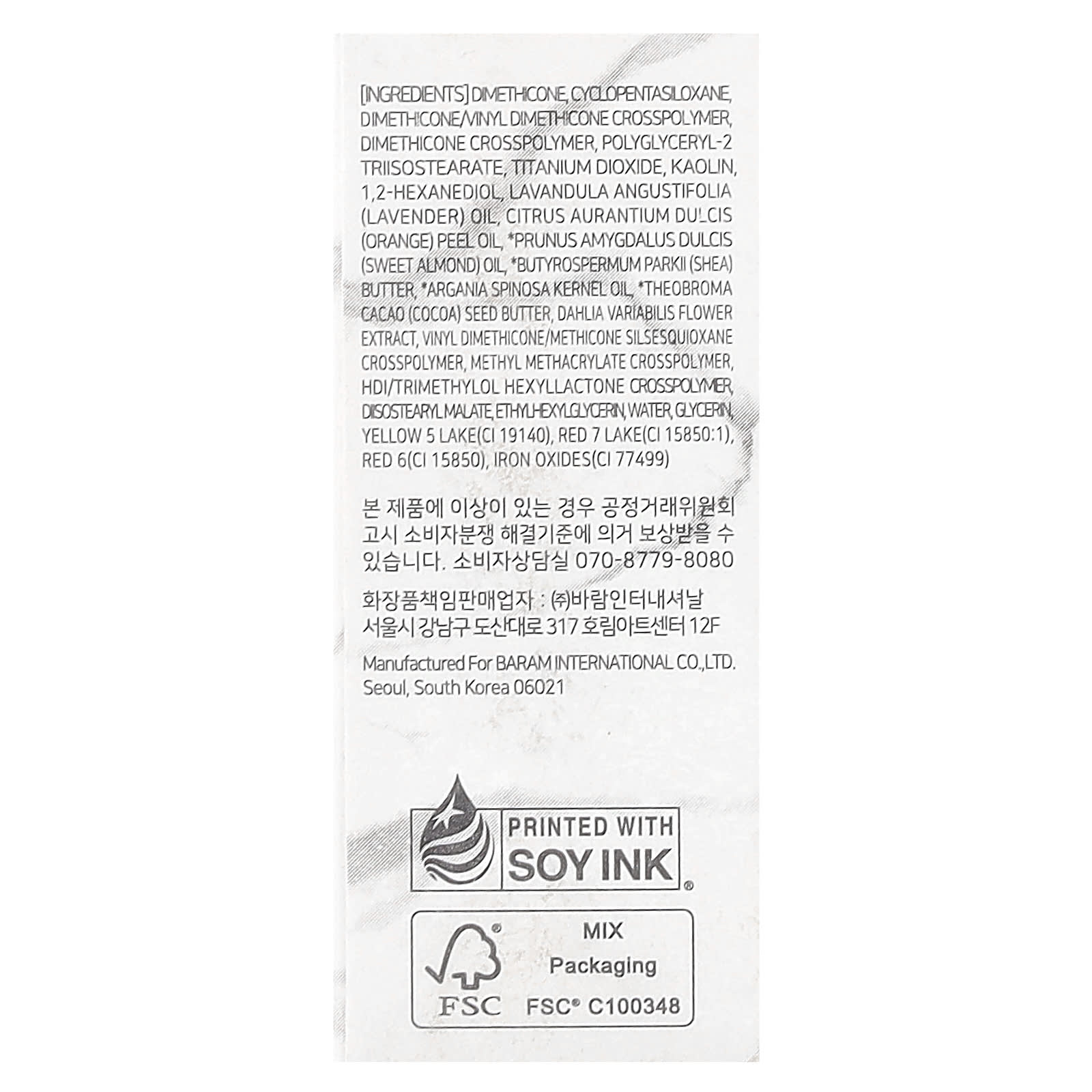 диметикон, циклопентасилоксан, диметикон/винил диметикон кроссполимер, диметикон кроссполимер, полиглицерил-2 триизостеарат, диоксид титана, каолин 1,2-гександиол, лавандовое масло (Lavandula angustifolia), масло из цедры апельсина (Citrus aurantium dulcis) * масло сладкого миндаля (Prunus amygdalus dulcis), масло ши (Butyrospermum parkii), * масло из косточек аргании (Argania spinosa) * масло из семян какао (Theobroma cacao), экстракт цветков георгина (Dahlia variabilis), винил диметикон/метикон силсесквиоксан кроссполимер, метил метакрилат кроссполимер, гександиизоцианат/триметилол хексиллактона кроссполимер, дисостеарил малат, этилгексилглицерин, вода, глицерин, желтое 5 озеро (CI 19140), красное озеро 7 (CI 15850: 1), красный 6 (CI 15850), оксиды железа (CI 77499).