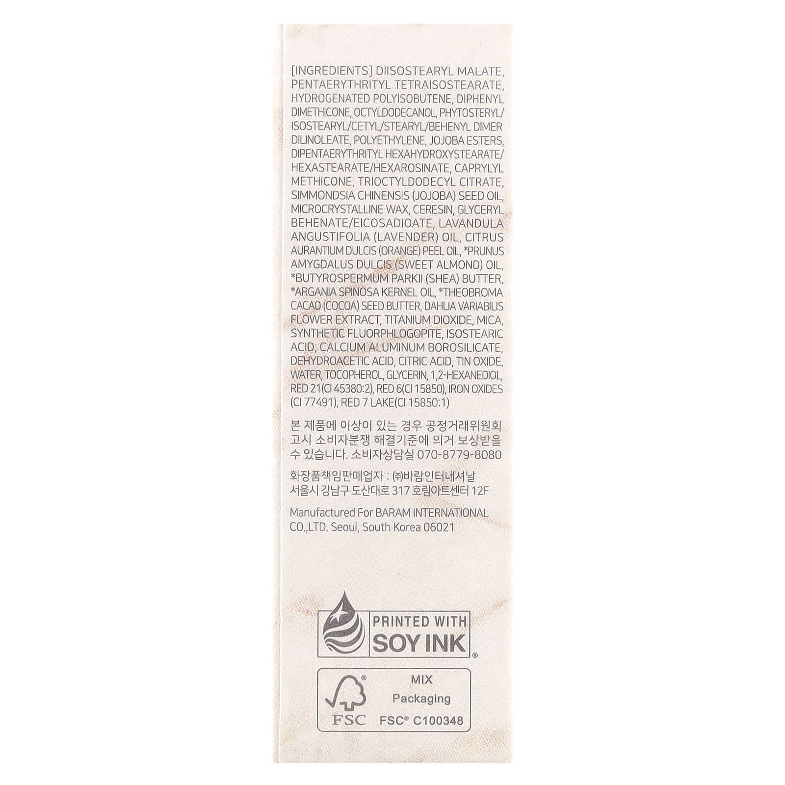 Диизостеарил малат, пентаэритритил тетраизостеарат, гидрогенизированный полиизобутен, дифенил диметикон, октилдодеканол, фитостерил / изостеарил / цетил / стеарил / бегенил димер дилинолеат, полиэтилен, эфиры жожоба, дипентаэритритил гексагидроксистеарат / гексастеарат / гексарозинат, каприлил метикон, триоктилдодецилцитрат, масло из семян жожоба (Simmondsia chinensis), микрокристаллический воск, церезин, глицерил бегенат/эйкозадиоат, лавандовое масло (Lavandula angustifolia), масло из цедры апельсина (Citrus aurantium dulcis), масло сладкого миндаля (Prunus amygdalus dulcis), масло ши (Butyrospermum parkii), масло из косточек аргании (Argania spinosa), масло из семян какао (Theobroma), экстракт цветков георгина (Dahlia variabilis), диоксид титана, слюда, синтетический фторфлогопит, изостеариновая кислота, кальций алюминий боросиликат, дегидроуксусная кислота, лимонная кислота, оксид олова, вода, токоферол, глицерин, 1,2-гександиол, красный 21 (CI 45380: 2), красный 6 (CI 15850), оксиды железа (CI 77491), красное озеро 7 (CI 15850: 1).