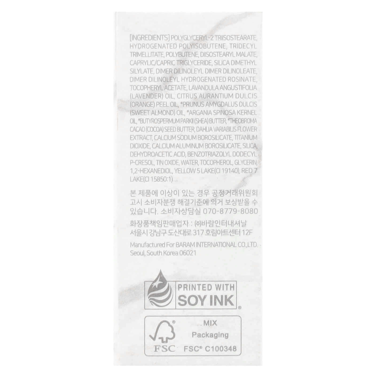 Полиглицерил-2 триизостеарат, гидрогенизированный полиизобутен, тридецил тримеллитат, полибутен, диизостеарил малат каприловый / каприновый триглицерид, диметил силилат диоксида кремния, димер дилинолеил димер дилинолеат, димер дилинолеил гидрогенизированная канифоль, токоферилацетат, лавандовое масло (Lavandula angustifolia), масло из цедры апельсина (Citrus aurantium dulcis), масло сладкого миндаля (Prunus amygdalus dulcis), аргановое масло (Argania spinosa), масло ши (Butyrospermum parkii), масло из зерен какао (Theobroma cacao), экстракт цветков георгина (Dahlia variabilis), кальций натрий боросиликат, диоксид титана, кальций алюминий боросиликат, диоксид кремния, дегидроуксусная кислота, бензотриазолил додецил п-крезол, оксид олова, вода, токоферол, глицерин, 1,2-гександиол, краситель желтый 5 лак (CI 19140), красное озеро 7 (CI 15850: 1).