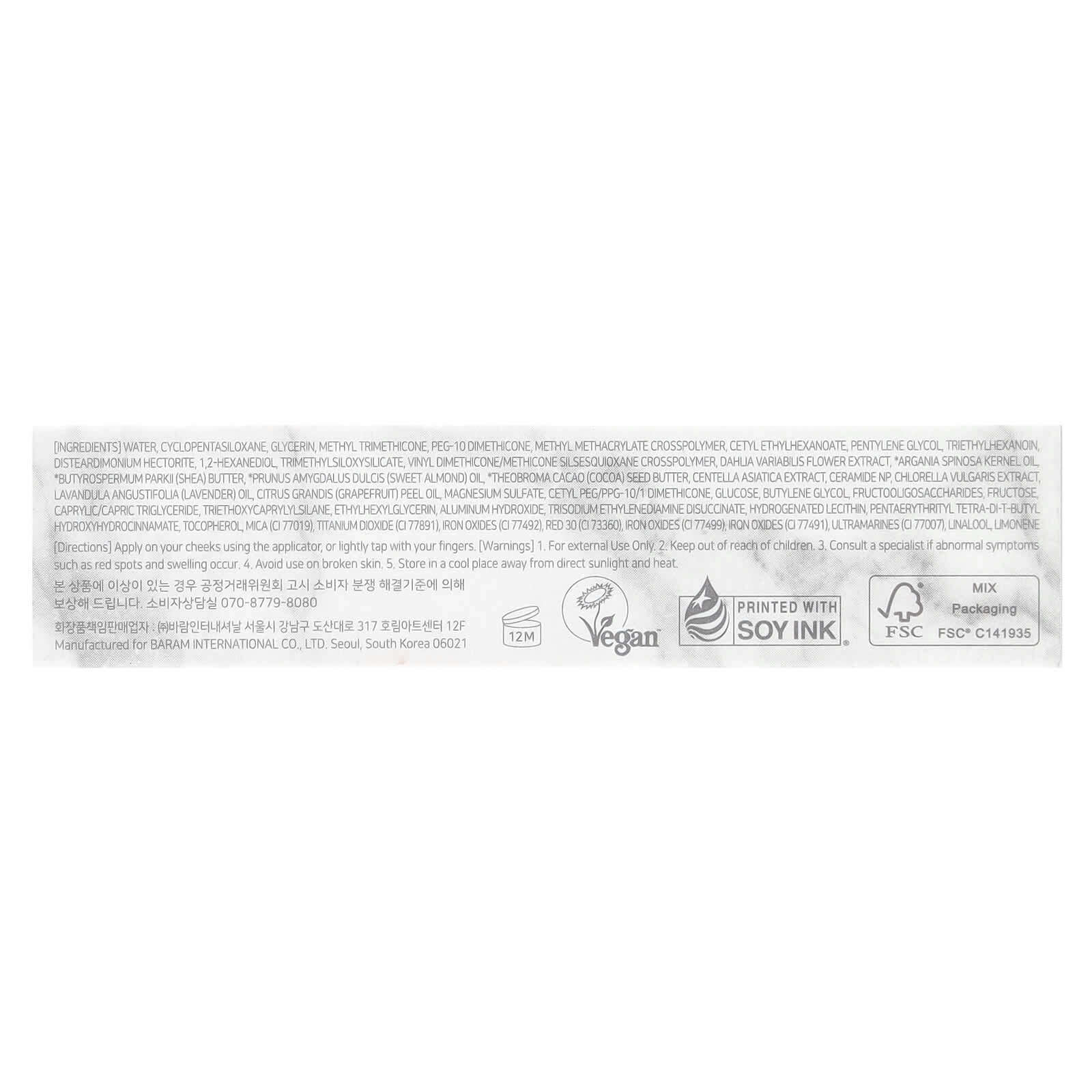 Вода, циклопентасилоксан, глицерин, метилтриметикон, ПЭГ-10 диметикон, метил метакрилат кроссполимер, цетилэтилгексаноат, пентилен гликоль, триэтилгексаноин, дистеардимония гекторит, 1,2-гександиол, триметилсилоксисиликат, винил диметикон/метикон силсесквиоксан кроссполимер, экстракт цветков георгина (Dahlia variabilis), масло из косточек аргании (Argania spinosa), масло ши (Butyrospermum parkii), масло сладкого миндаля (Prunus amygdalus dulcis), масло из семян какао (Theobroma), экстракт готу колы (Centella asiatica), керамид NP, экстракт хлореллы (Chlorella vulgaris), лавандовое масло (Lavandula angustifolia), масло из цедры грейпфрута (Citrus grandis), сульфат магния, цетил ПЭГ/ППГ-10/1 диметикон, глюкоза, бутиленгликоль, фруктоолигосахариды, фруктоза, каприловый/каприновый триглицерид, триэтоксикаприлилсилан, этилгексилглицерин, гидроксид алюминия, тринатрия этилендиамин дисукцинат, гидрогенизированный лецитин, пентаэритритил тетра-ди-трет-бутил гидроксигидроциннамат, токоферол, слюда (CI 77019), диоксид титана (CI 77891), оксиды железа (CI 77492), красный 30 (CI 73360), оксиды железа (CI 77499), оксиды железа (CI 77491), ультрамарины (CI 77007), линалоол, лимонен.