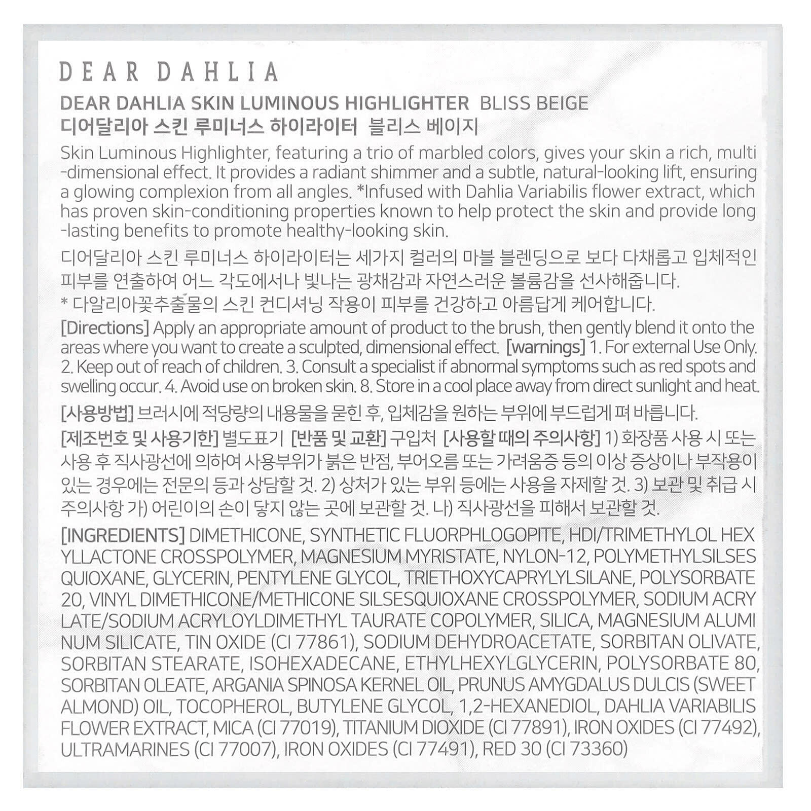 диметикон, синтетический фторфлогопит, гександиизоцианат/триметилол хексиллактона кроссполимер, миристат магния, нейлон-12, полиметилсилс хиоксан, глицерин, пентилен гликоль, триэтоксикаприлилсилан, полисорбат 20, винил диметикон/метикон силсесквиоксан кроссполимер, натрий акрилат/натрий акрилоилдиметилтаурат сополимер, диоксид кремния, алюмосиликат магния, оксид олова (CI 77861), дегидроацетат натрия, сорбитан оливат, сорбитан стеарат, изогексадекан, этилгексилглицерин, полисорбат 80, сорбитанолеат, аргановое масло (Argania spinosa), масло сладкого миндаля (Prunus amygdalus dulcis), токоферол, бутиленгликоль, 1,2-гександиол, экстракт цветков георгина (Dahlia variabilis), слюда (CI 77019), диоксид титана (CI 77891), оксиды железа (CI 77492), ультрамарины (CI 77007), оксиды железа (CI 77491), красный 30 (CI 73360).