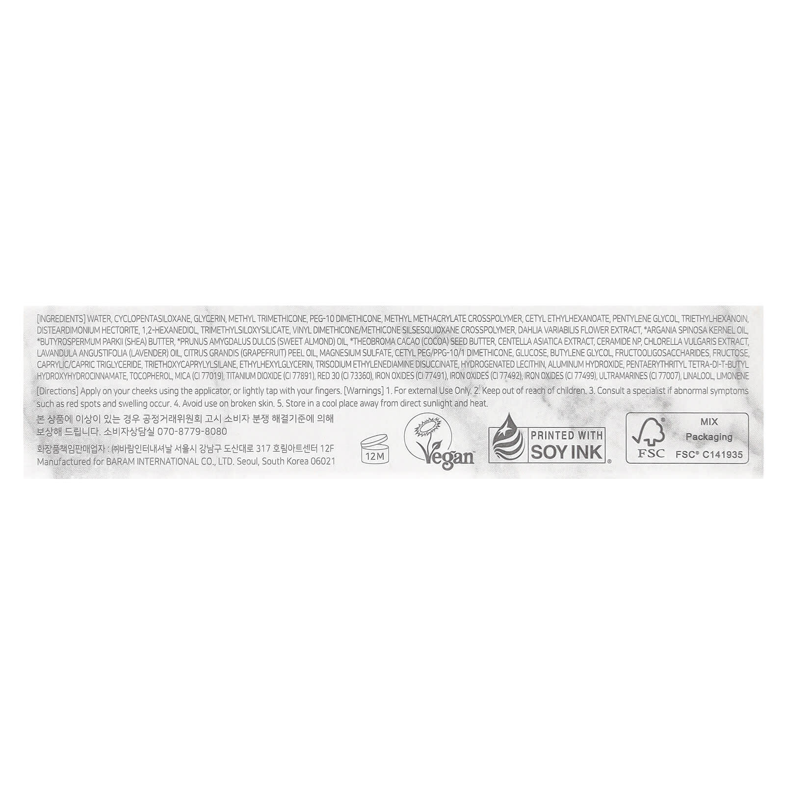 Вода, циклопентасилоксан, глицерин, метилтриметикон, ПЭГ-10 диметикон, метил метакрилат кроссполимер, цетилэтилгексаноат, пентилен гликоль, триэтилгексаноин, дистеардимония гекторит, 1,2-гександиол, триметилсилоксисиликат, винил диметикон/метикон силсесквиоксан кроссполимер, экстракт цветков георгина (Dahlia variabilis), масло из косточек аргании (Argania spinosa), масло ши (Butyrospermum parkii), масло сладкого миндаля (Prunus amygdalus dulcis), масло из семян какао (Theobroma), экстракт готу колы (Centella asiatica), керамид NP, экстракт хлореллы (Chlorella vulgaris), лавандовое масло (Lavandula angustifolia), масло из цедры грейпфрута (Citrus grandis), сульфат магния, цетил ПЭГ/ППГ-10/1 диметикон, глюкоза, бутиленгликоль, фруктоолигосахариды, фруктоза, каприловый/каприновый триглицерид, триэтоксикаприлилсилан, этилгексилглицерин, тринатрия этилендиамин дисукцинат, гидрогенизированный лецитин, гидроксид алюминия, пентаэритритил тетра-ди-трет-бутил гидроксигидроциннамат, токоферол, слюда (CI 77019), диоксид титана (CI 77891), красный 30 (CI 73360), оксиды железа (CI 77491), оксиды железа (CI 77492), оксиды железа (CI 77499), ультрамарины (CI 77007), линалоол, лимонен.