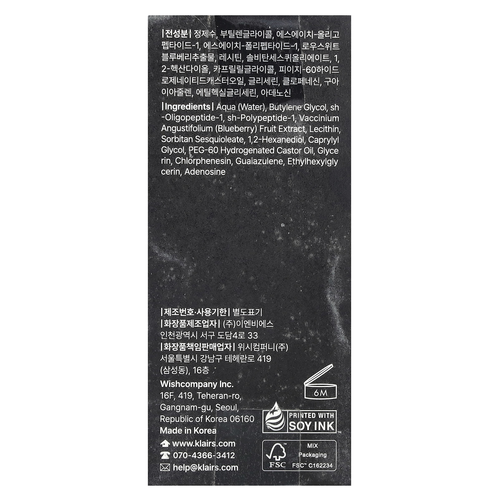 Вода, бутиленгликоль, sh-олигопептид-1, sh-полипептид-1, экстракт ягод голубики (Vaccinium angustifolium), лецитин, сорбитана сесквиолеат, 1,2-гександиол, каприлилгликоль, ПЭГ-60 гидрогенизированное касторовое масло, глицерин, хлорфенезин, гвайазулен, этилгексилглицерин, аденозин.