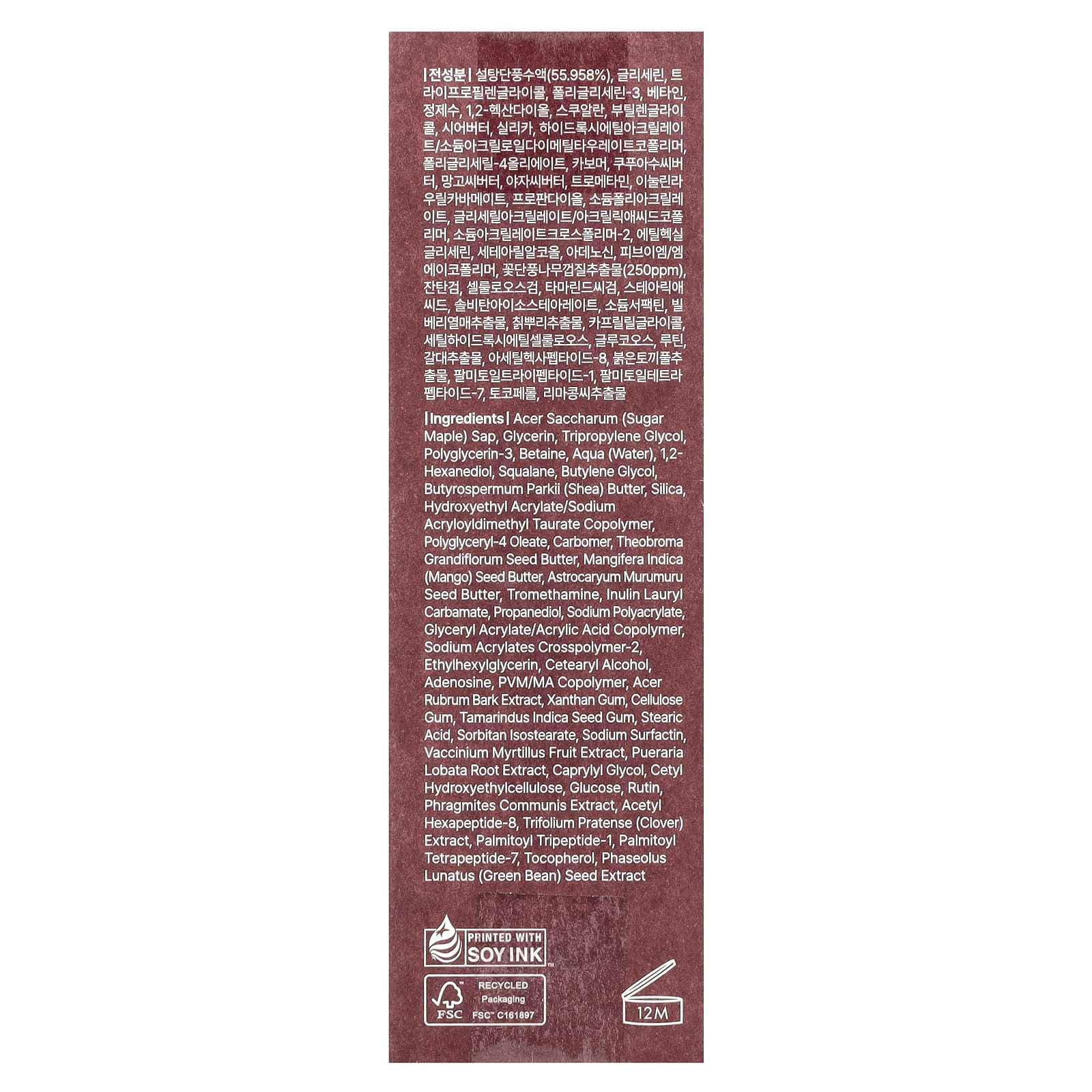 Сок клена сахарного (Acer saccharum), глицерин, трипропиленгликоль, полиглицерин-3, бетаин, вода (Aqua), 1,2-гександиол, сквалан, масло ши (бутиленгликоль), диоксид кремния, гидроксиэтил акрилат/натрия акрилоилдиметилтаурата сополимер, полиглицерил-4-олеат, карбомер, масло семян купуасу (Theobroma grandiflorum), масло из косточек манго (Mangifera indica), масло семян мурумуру (Astrocaryum murumuru), трометамин, инулин лаурил карбамат, пропандиол, полиакрилат натрия, сополимер глицерил акрилата/акриловой кислоты, акрилат натрия кроссполимер-2, этилгексилглицерин, цетеариловый спирт, аденозин, ПВМ/МА сополимер, экстракт коры Acer rubrum, ксантановая камедь, целлюлозная камедь, камедь тамаринда индийского (Tamarindus indica), стеариновая кислота, сорбитан изостеарат, сурфактин натрия, экстракт ягод черники (Vaccinium myrtillus), экстракт корней пуэрарии дольчатой (Pueraria lobata), каприлилгликоль, цетил гидроксиэтилцеллюлоза, глюкоза, рутин, экстракт Phragmites communis, ацетил гексапептид-8, экстракт клевера (Trifolium pratense), пальмитоил трипептид-1, пальмитоил тетрапептид-7, токоферол, экстракт семян зеленой фасоли (Phaseolus lunatus).