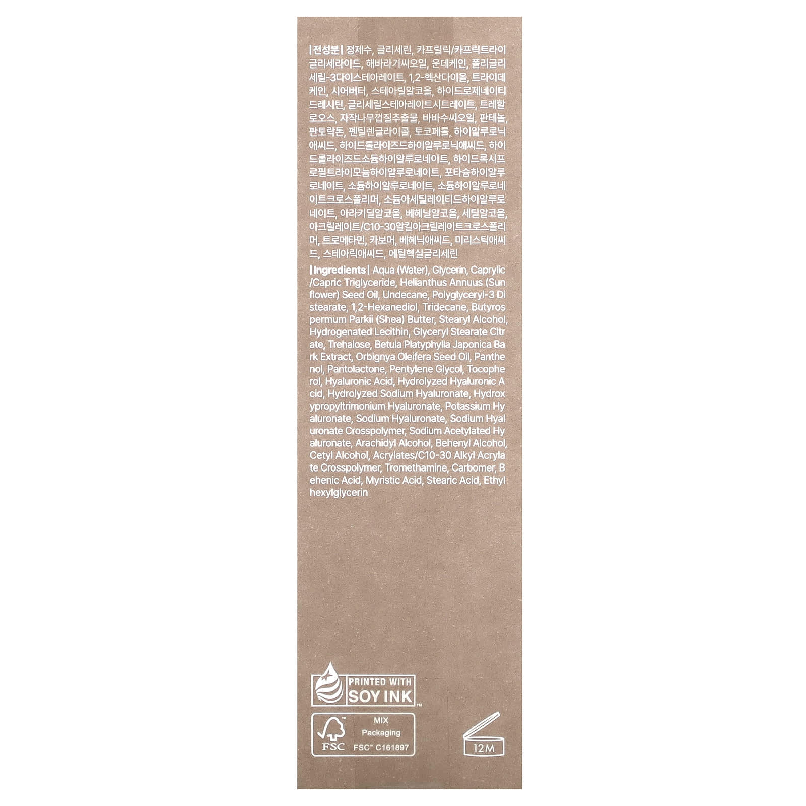 Вода, глицерин, каприловый/каприновый триглицерид, масло семян подсолнечника (Helianthus annuus), ундекан, полиглицерил-3 ди стеарат, 1,2-гександиол, тридекан, масло ши (Butyrospermum parkii), стеариловый спирт, гидрогенизированный лецитин, глицерил стеарат цитрат, трегалоза, экстракт коры березы плосколистной японской (Betula platyphylla japonica), масло из семян бабассу (Orbignya oleifera), пантенол, пантолактон, пентилен гликоль, токоферол, гиалуроновая кислота, гидролизованная гиалуроновая кислота, гидролизованный гиалуронат натрия, гидроксипропилтримония гиалуронат, гиалуронат калия, гиалуронат натрия, гиалуронат натрия кроссполимер, ацетилированный гиалуронат натрия, арахидиловый спирт, бегениловый спирт, цетиловый спирт, акрилат/c10-30 алкил акрилат кроссполимер, трометамин, карбомер, бегеновая кислота, миристиновая кислота, стеариновая кислота, этилгексилглицерин.