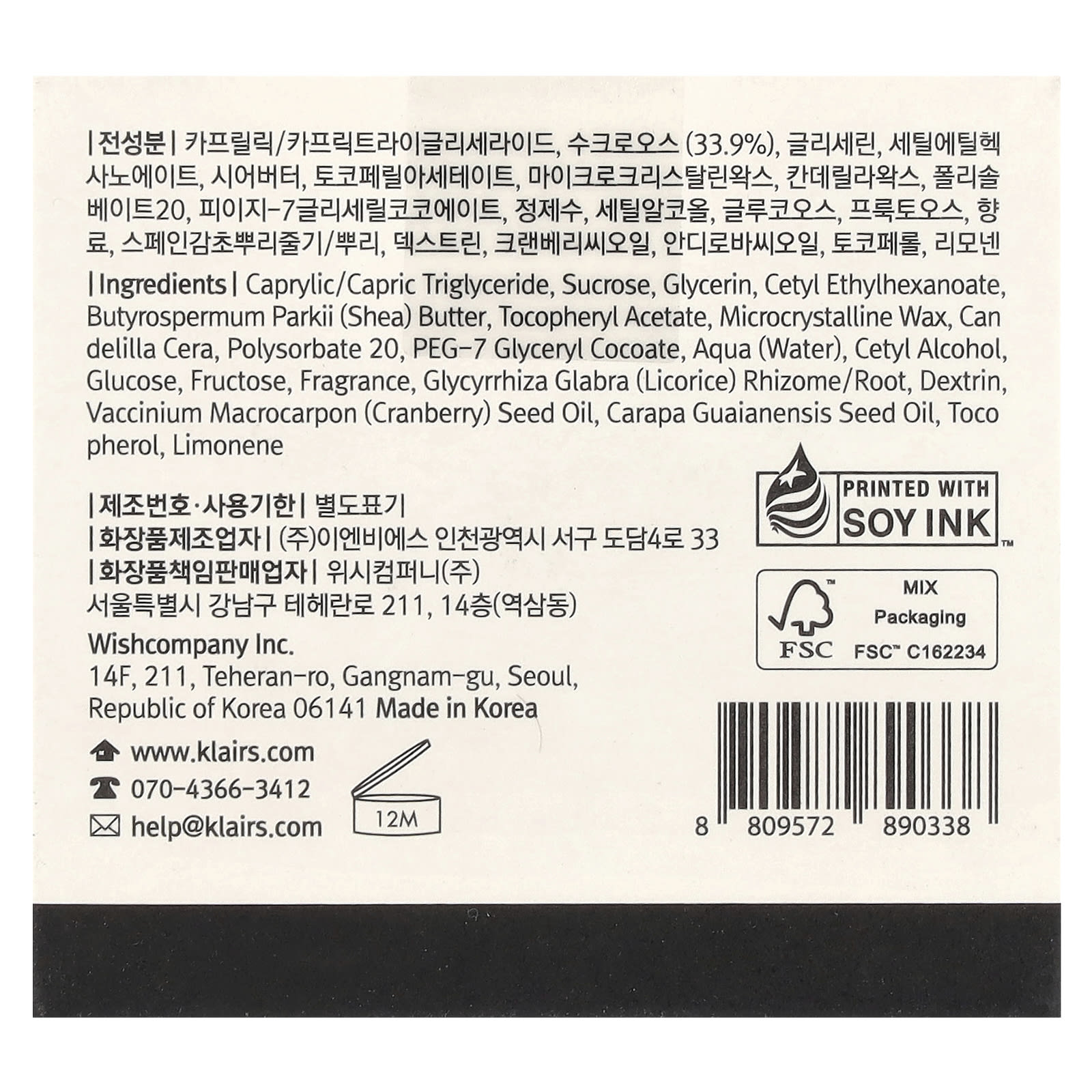 Каприловый/каприновый триглицерид, сахароза, цетил этилгексаноат, глицерин, масло ши (Butyrospermum parkii), токоферилацетат, Candelilla cera, ПЭГ-7 глицерил кокоат, полисорбат 20, микрокристаллический воск, цетиловый спирт, патока, порошок из корня солодки (Glycyrrhiza glabra), парфюмерная композиция (отдушка), масло семян андироба (Carapa guaianensis), масло из семян клюквы (Vaccinium macrocarpon), лимонен.