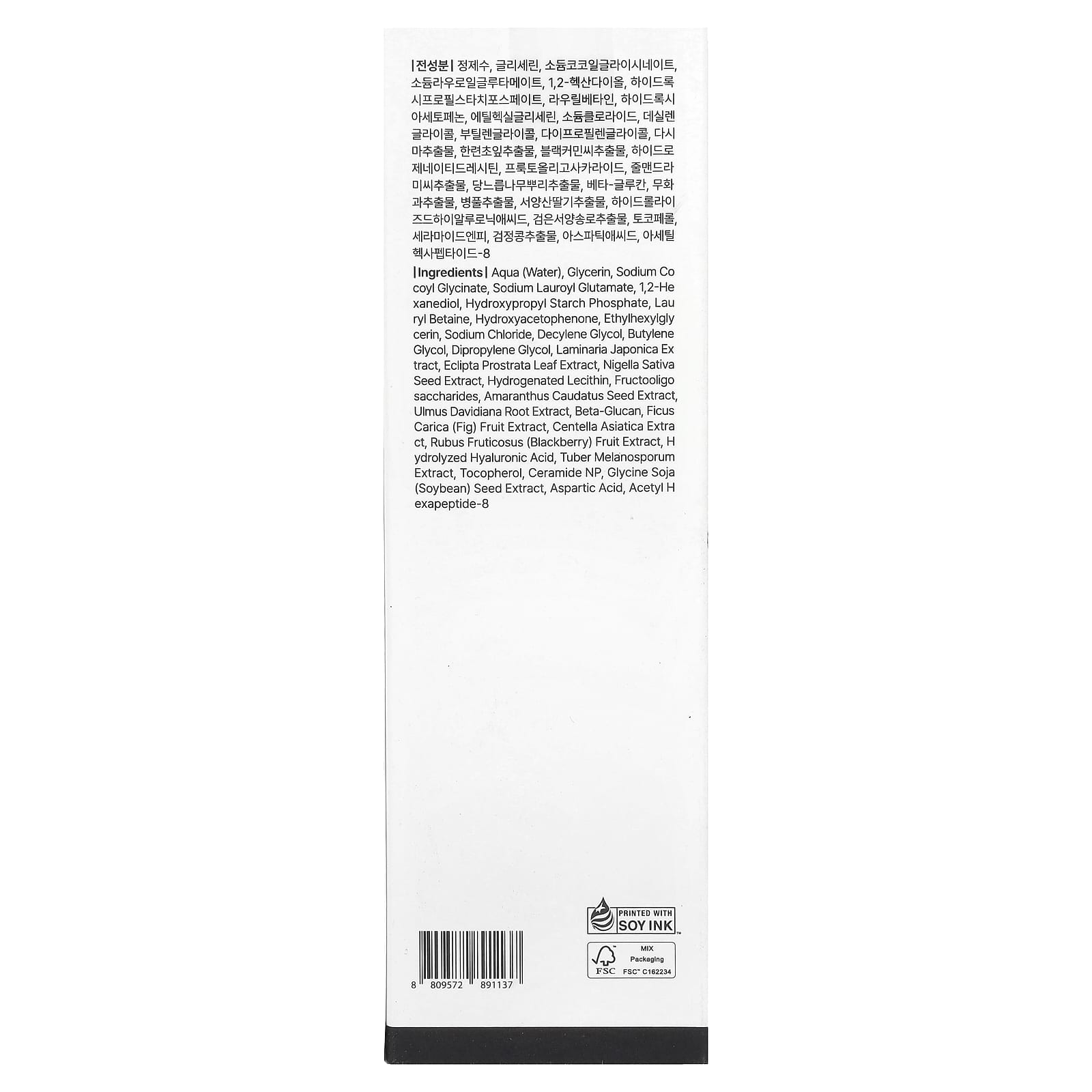 Вода, глицерин, кокоил глицинат натрия, лауроил глутамат натрия, 1,2-гександиол, гидроксипропилфосфат крахмала, лаурил бетаин, гидроксиацетофенон, этилгексилглицерин, хлорид натрия, дециленгликоль, бутиленгликоль, дипропиленгликоль, экстракт ламинарии японской, экстракт листьев eclipta prostrata, экстракт семян чернухи (Nigella sativa), гидрогенизированный лецитин, фруктоолигосахариды, экстракт семян амаранта хвостатого, экстракт корня ульмуса давидиана, бета-глюкан, экстракт плодов инжира, экстракт центеллы азиатской, экстракт плодов ежевики (Rubus fruticosus), гидролизованная гиалуроновая кислота, экстракт клубня меланоспорум, токоферол, керамид NP, экстракт семян сои (Glycine soja), аспарагиновая кислота, ацетил гексапептид-8.